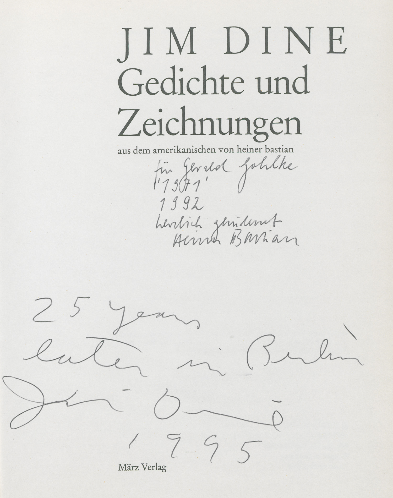 Erste deutsche Ausgabe. In kleiner nummer. Auflage erschienen. Die Texte in Englisch und Deutsch. Das "Herz"-Motiv, das hier zwölfmal variiert wird, ist eines der zentralen Motive in Jim Dines Oeuvre. Das Titelblatt mit eigenh. Widmung des Übersetzers Heiner Bastian und mit eigenh. Widmung von Jim Dine ("25 years later in Berlin - Jim Dine 1995"). – Gutes Exemplar.
