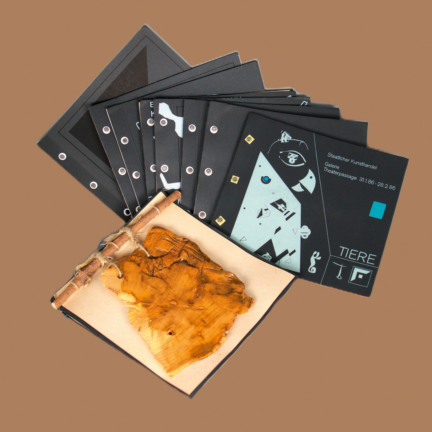 1. Katalog zur Ausstellung "Tiere", gestaltet von Wolfgang Henne. Mit mehreren Siebdrucken und Offsets sowie 12 Bildpostkarten. 31.1.-28.2.1986. - Eines von 200 Exemplaren (Gesamtauflage). Von W. Henne signiert.