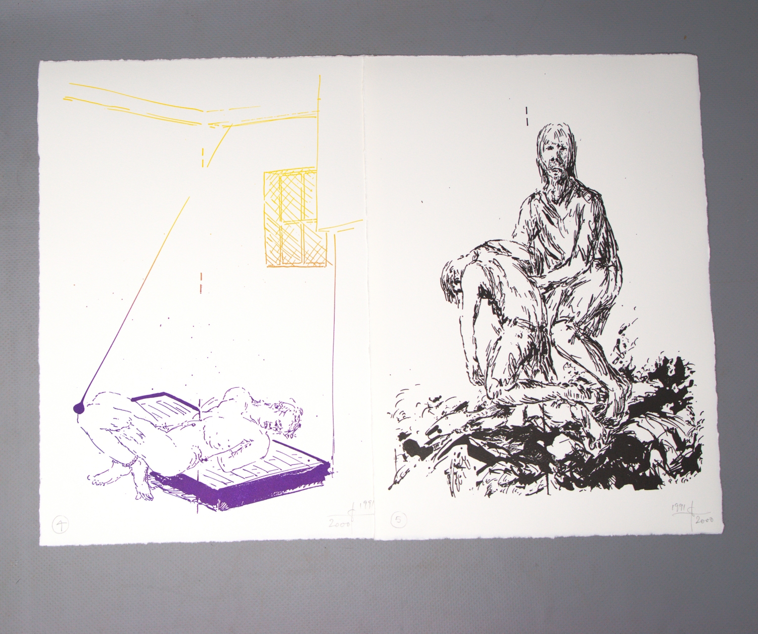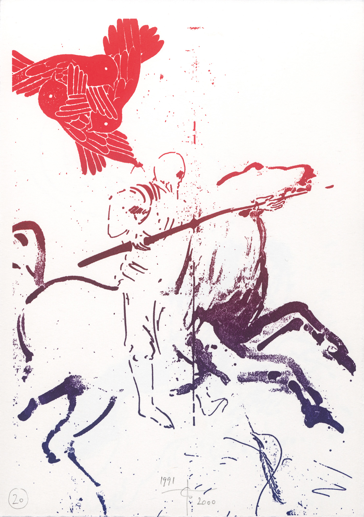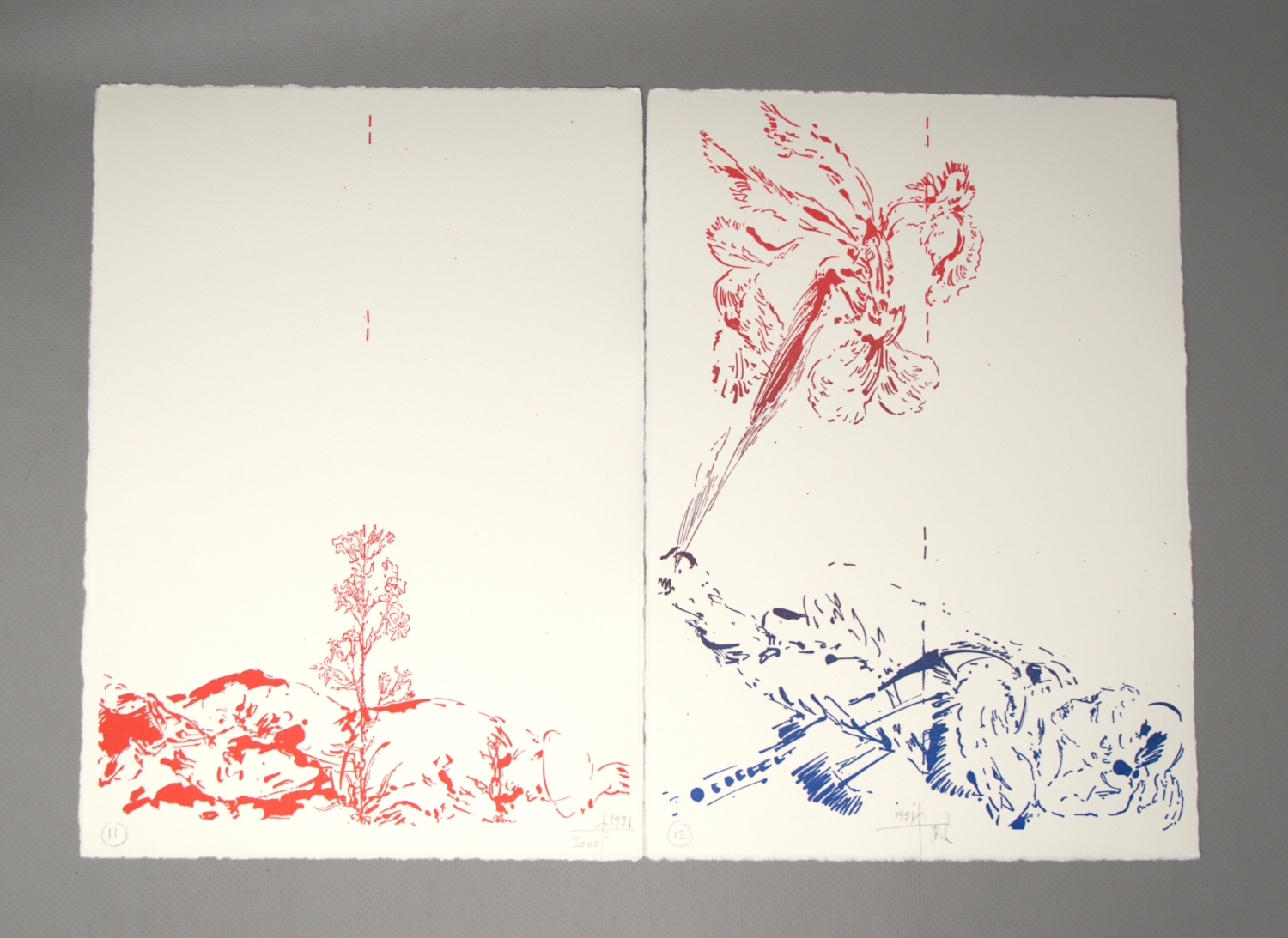 Hafner, Jonas. 24 Bilder während eines Krieges (Umschlagtitel). Mars auf Reisen. Folge von 24 farbigen Lithographien. 29,5 x 21 cm. Lose Blätter in OUmschlag mit hs. Titel und 2 Deckelillustrationen in OHolzschnitt. Hamburg, Edition Griffelkunst, 2000.