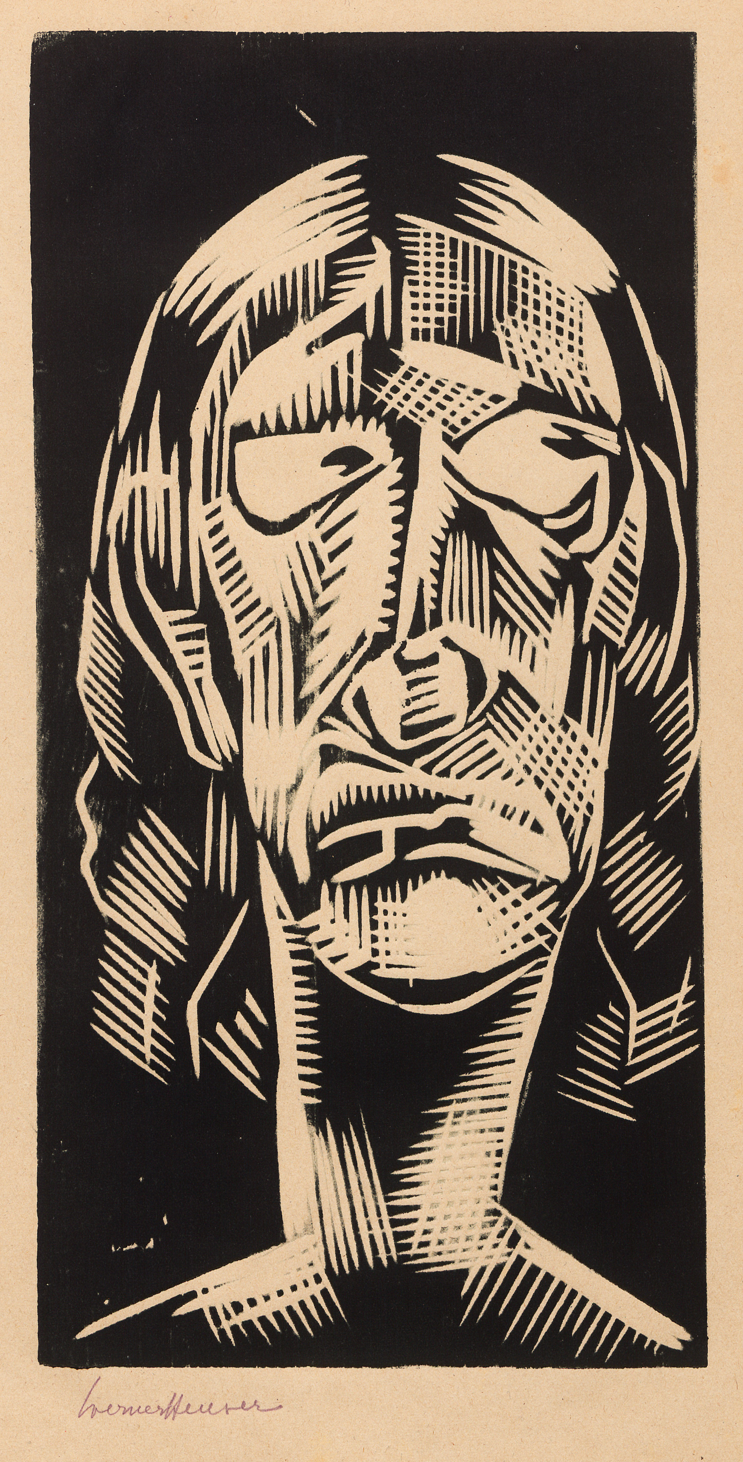 Heuser, Werner. Köpfe. Vorwort von Mynona (d.i. S. Friedlaender). 2 Doppelblatt und 11 Tafeln mit 11 signierten Holzschnitten auf bräunlichem Papier. 39 x 23,5 cm. Lose Bl. in OHLeinenmappe (etwas berieben, innen stockfleckig) mit 2 Schließbändern. Düsseldorf, Galerie Flechtheim, 1921.