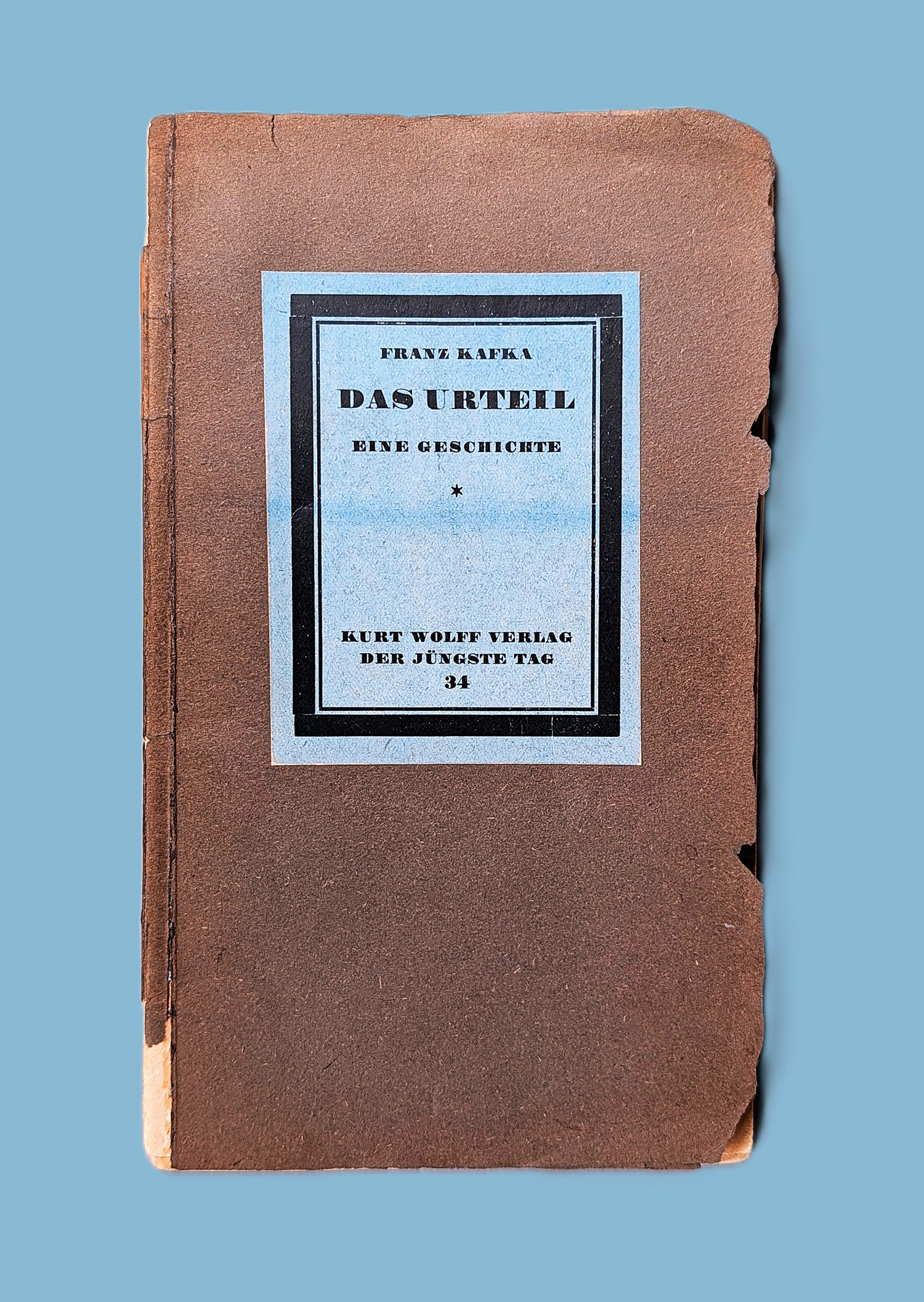 Kafka, Franz. Das Urteil. Eine Geschichte. 28 S., 2 Bl. 22 x 13 cm. Schwarze OBroschur (stärker ausgeblichen, mit Randläsuren und Fehlstellen, Rücken defekt) mit blauem Titelschild (verblasst) auf dem Vorderdeckel. Leipzig, Kurt Wolff, 1916.