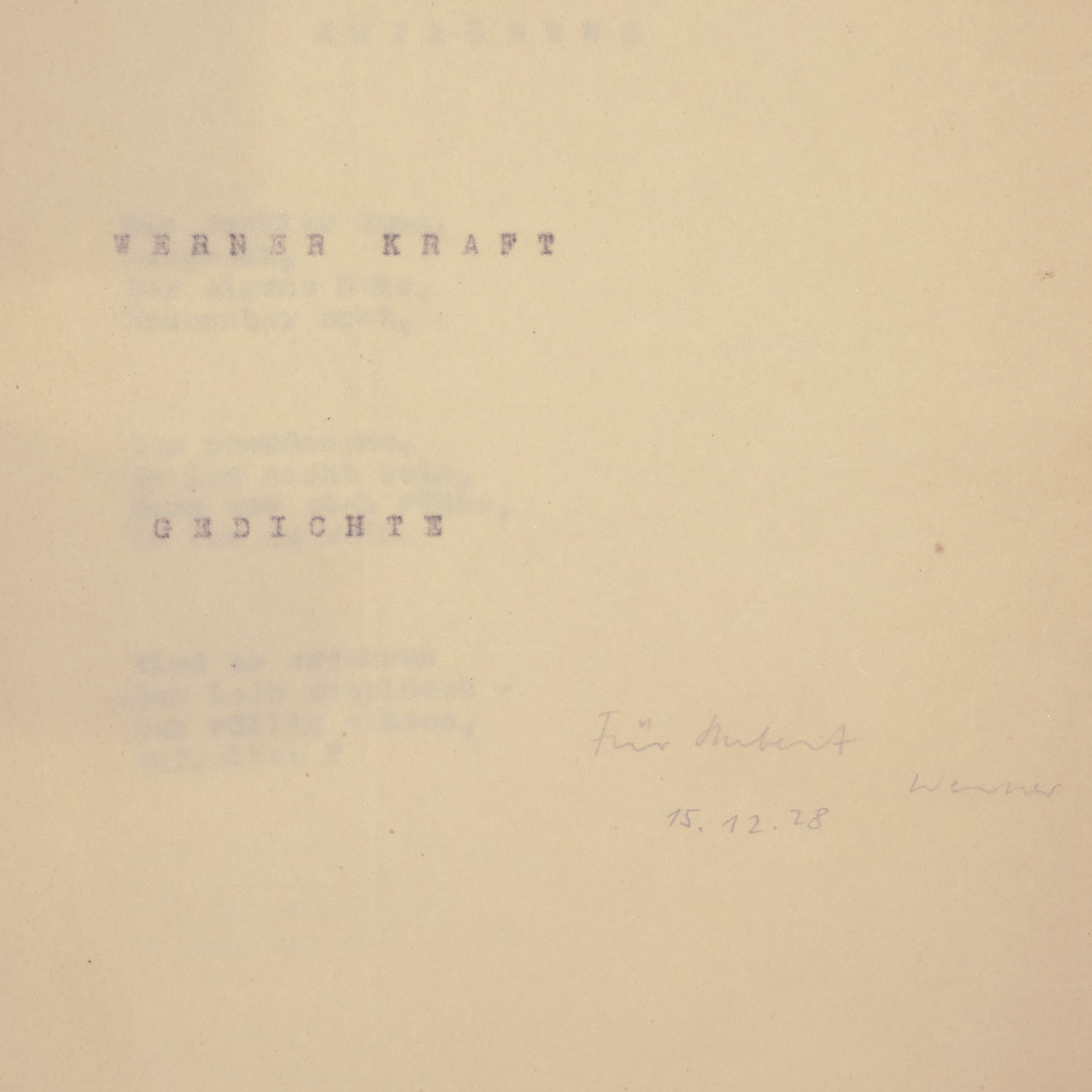 Von dem 32-jährigen Werner Kraft als "Durchschlagexemplar" hergestelltes Typoskript mit einer Sammlung seiner Gedichte. Es dürften nur drei Exemplare entstanden sein, da in die Walze einer Schreibmaschine kaum mehr als 6 Blatt (Blanko- und Kohlepapier) einzuspannen sind. Titelblatt mit eigenhändiger Widmung von Werner Kraft: "Für Hubert [Breitenbach] - Werner - 15.12.28". Die Identifizierung des Widmungsempfängers stützt sich auf das Findbuch des Deutschen Literaturarchives in Marbach. Neben den Durchschlägen sind zwei Gedichte als Originaltyposkripte enthalten, der Titel von zwei weiteren Gedichten wurde von Werner Kraft eigenhändig geändert ("Abschied" in "Erinnerung" und "Nächtliches Dunkel" in "Mitternacht").