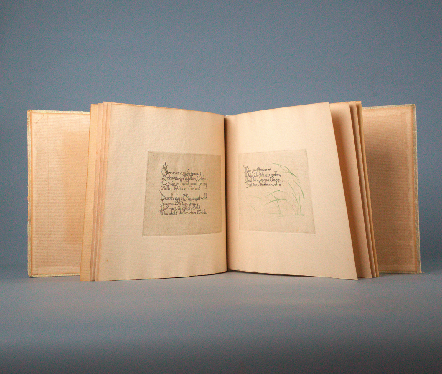 Lenau, Nicolaus. Schilflieder. Mit gestochenem Titel und 9 gestochenen Textseiten von Wilhelm Redemann. 14 x 16,5 cm. OSeide (gebräunt, mit geringf. Fehlstellen und fleckig) in einfacher Fadenheftung (teils gelockert). Hannover, Banas & Dette, 1923.