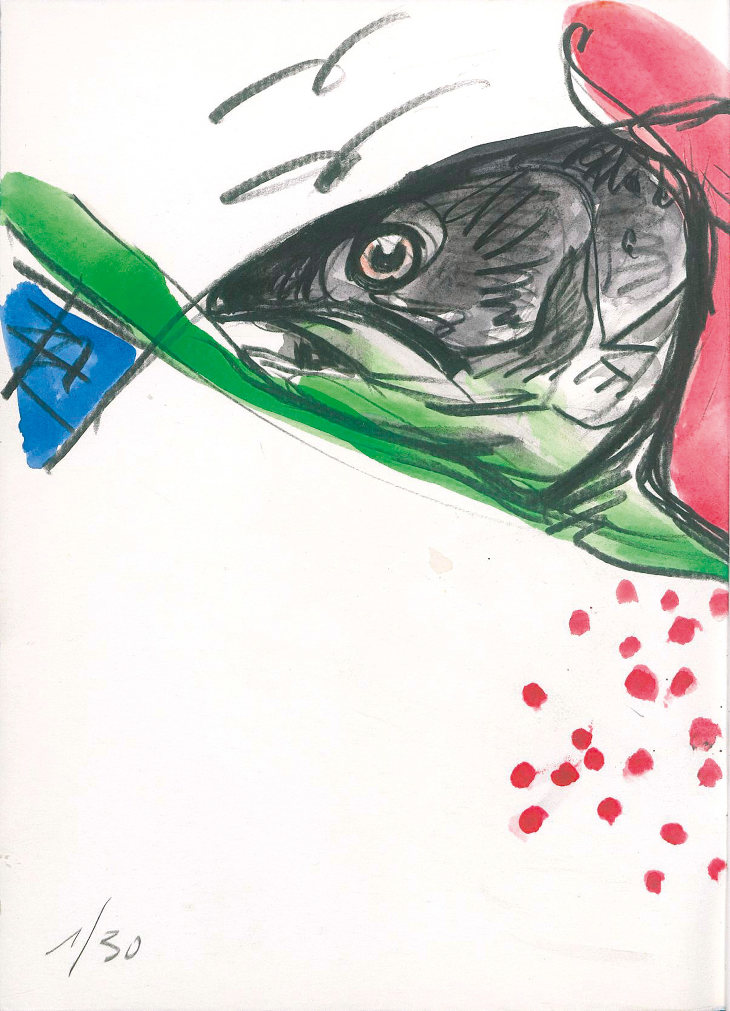 Eines von 30 nummerierten Exemplaren der Vorzugsausgabe mit einer aquarellierten, doppelblattgroßen Kohlestiftzeichnung (Motiv: Fisch). Titel mit eigenhändiger Widmung des Künstlers. Die Zeichnung ist eingebunden und wird durch den Buchblock geteilt. – Sehr gut erhalten.