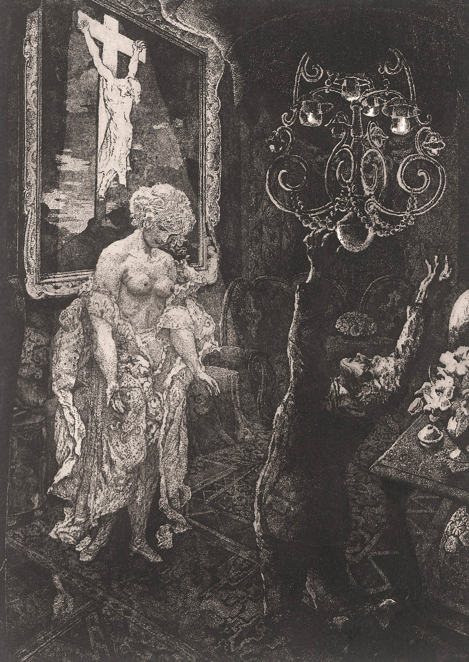 Muschler, Reinhold C. Die Heilandin. Fünf Legenden der Liebe. 127 S. Mit 7 (inkl. illustr. Titel) signierten Orig.-Radierungen von Ferdinand Staeger. 30 x 21,5 cm. OPergament (fleckig, berieben und mit kleinen Fehlstellen) mit goldgeprägtem RTitel, VDeckel und Kopfgoldschnitt. Leipzig, M. Koch, 1924.