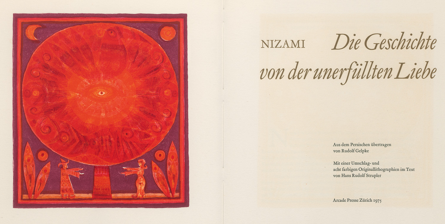 Nizami. Die Geschichte von der unerfüllten Liebe. Aus dem Persischen übertragen von Rudolf Gelpke. 43 S., 2 Bl. Mit 8 farbigen Orig.-Lithographien von Hans Rudolf Strupler. 35 x 28,5 cm. Illustriertes OHalbpergament mit goldgeprägtem RTitel in OPapp-Schuber (leicht bestoßen).