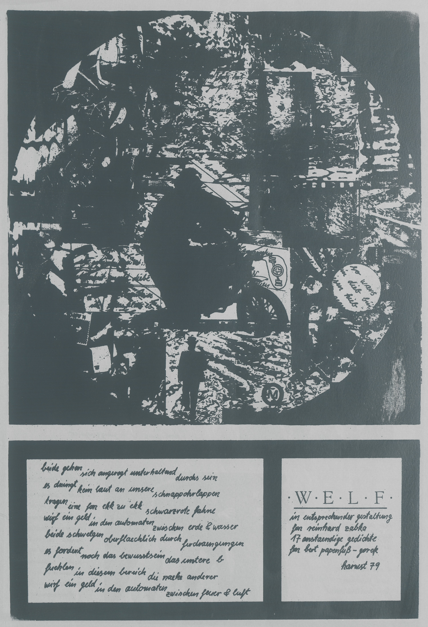 Papenfuß-Gorek, Bert. WELF - 17 anstaendige gedichte. Zwei unterschiedl. Folgen. Im Manuskript und durchgehend illustriert in Siebdruck von Reinhard Zabka. Zusammen 7 Bl. 63,5 x 49 cm. Klammerheftung. O. O. 1979.