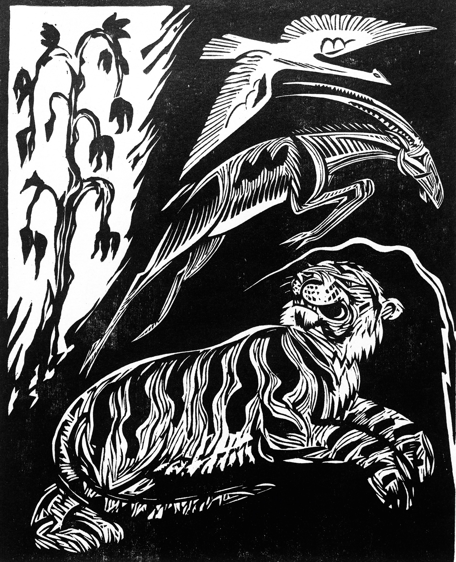 Puschkin, Alexander S. Der Antiar (Giftbaum). Mit 6 signierten Originalholzschnitten von W. Masjutin. 48 x 34,5 cm. OBroschur (berieben, fleckig und unterers Kapital mit Einriss) in Fadenbindung mit DTitel. Berlin, Newa, 1922.