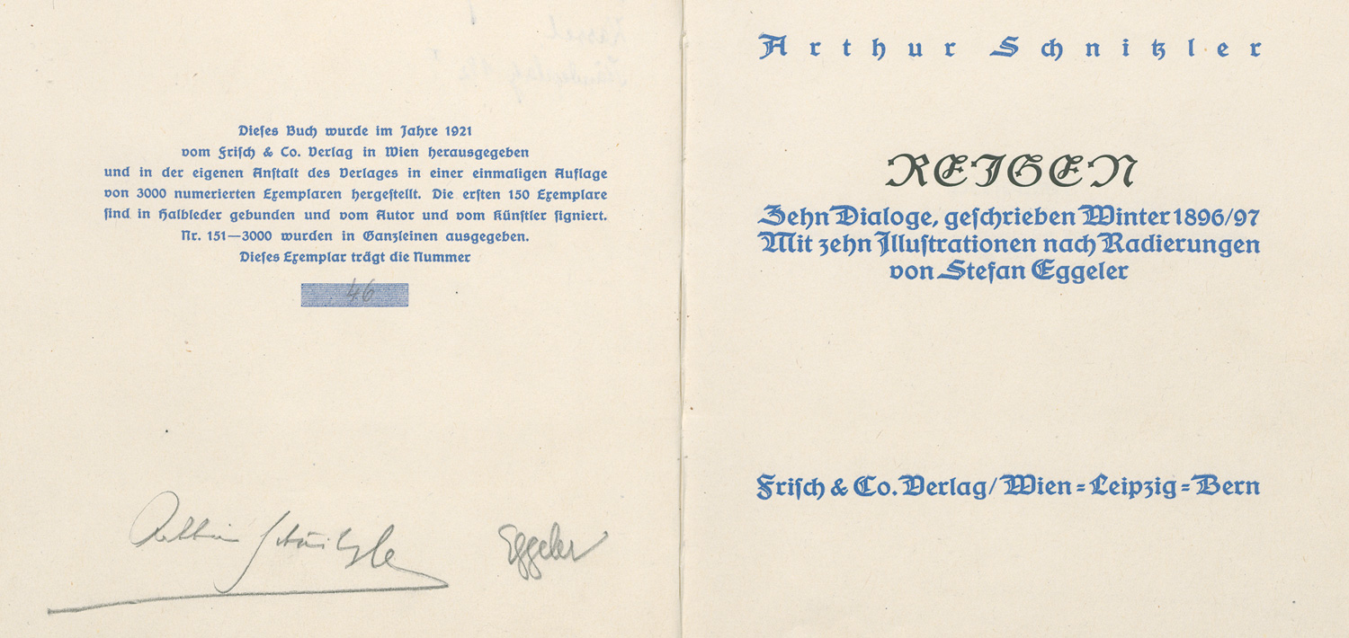 Hayn-Gotendorf IX, 534. Sennewald 21, 6. – Eines von 150 nummerierten Exemplaren der Vorzugsausgabe in Halbleder, von Schnitzler und Eggeler im Druckvermerk signiert (Gesamtauflage: 3000). Durchgängig in Blau und Schwarz gedruckt. Die Illustrationen des österreichischen Graphikers Stefan Eggeler (1894-1969) erschienen im gleichen Jahr als Mappenwerk und sind hier verkleinert wiedergegeben. – Es fehlt das erste weiße Blatt. Impressum recto mit zeitgenössischem Besitzeintrag, sonst wohlerhalten.