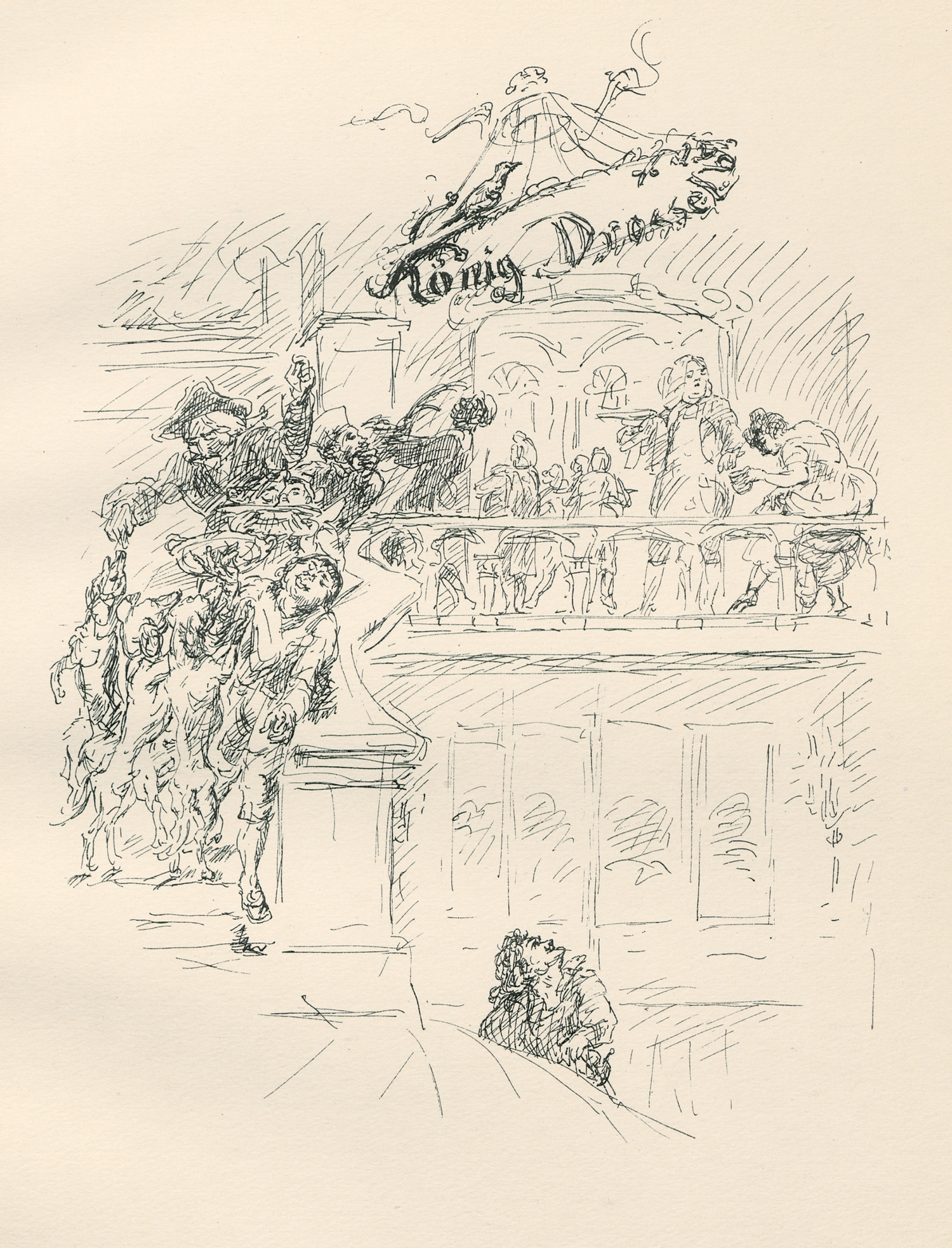Rümann 34b. – Eines von 360 nummerierten Exemplaren (Gesamtauflage). Druckvermerk vom Künstler signiert. – Papierbedingt leicht gebräunt, Titel minimal fingerfleckig, Innengelenk zwischen Seite acht und neun offen. – Dabei: Derselbe. Fitchers Vogel. Ein Märchen. Mit zwölf Steinzeichnungen von Max Slevogt. 14 S., 1 Bl. 34,5 x 24,5 cm. OHalbpergament (etwas lichtrandig) mit illustriertem VDeckel. Berlin, Bruno Cassierer, 1923. - Eines von 360 nummerierten Exemplaren (Gesamtauflage). Druckvermerk vom Künstler signiert.