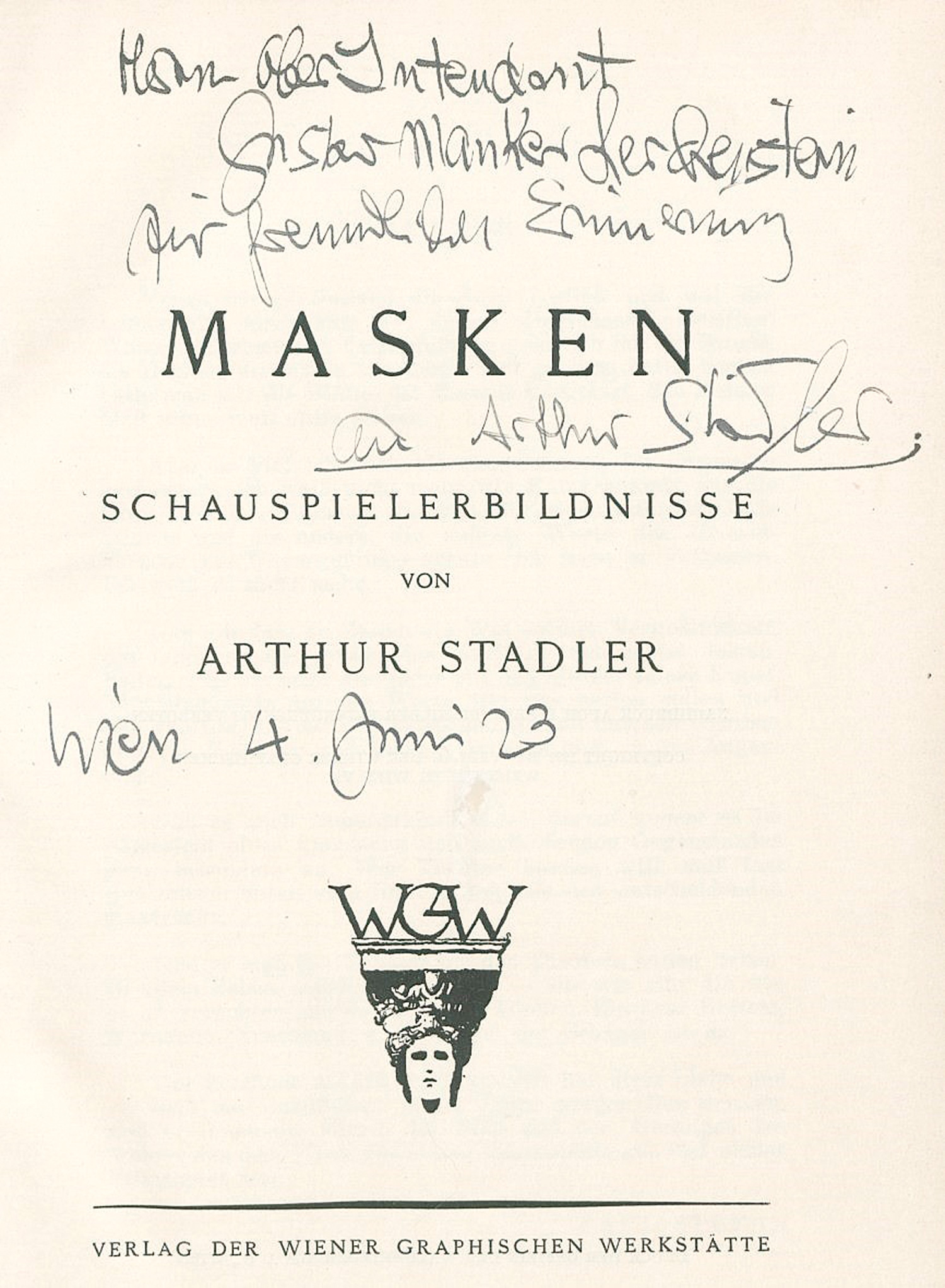 Titelblatt mit 5-zeiliger Widmung des Künstlers "Herrn Oberintendant Gustav Manker Lerchenstein zur freundlichen Erinnerung an Arthur Stadler Wien 4. Juni (19)23". – Wohlerhalten.