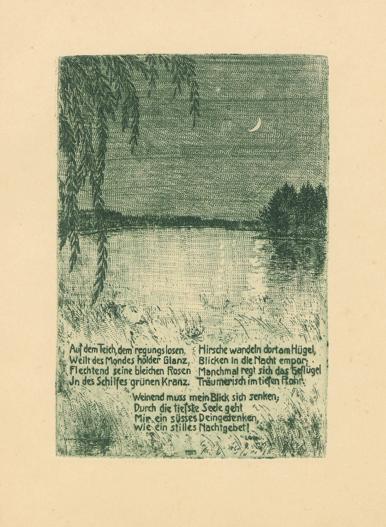 Der Grafiker Ferdinand Steiniger (1882-1973) ist besonders für seine stimmungsvollen Baum- und Waldlandschaften bekannt. Blätter befinden sich heute unter anderem im Bestand des British Museum. – Etwas stockfleckig, insbesondere im weißen Rand.