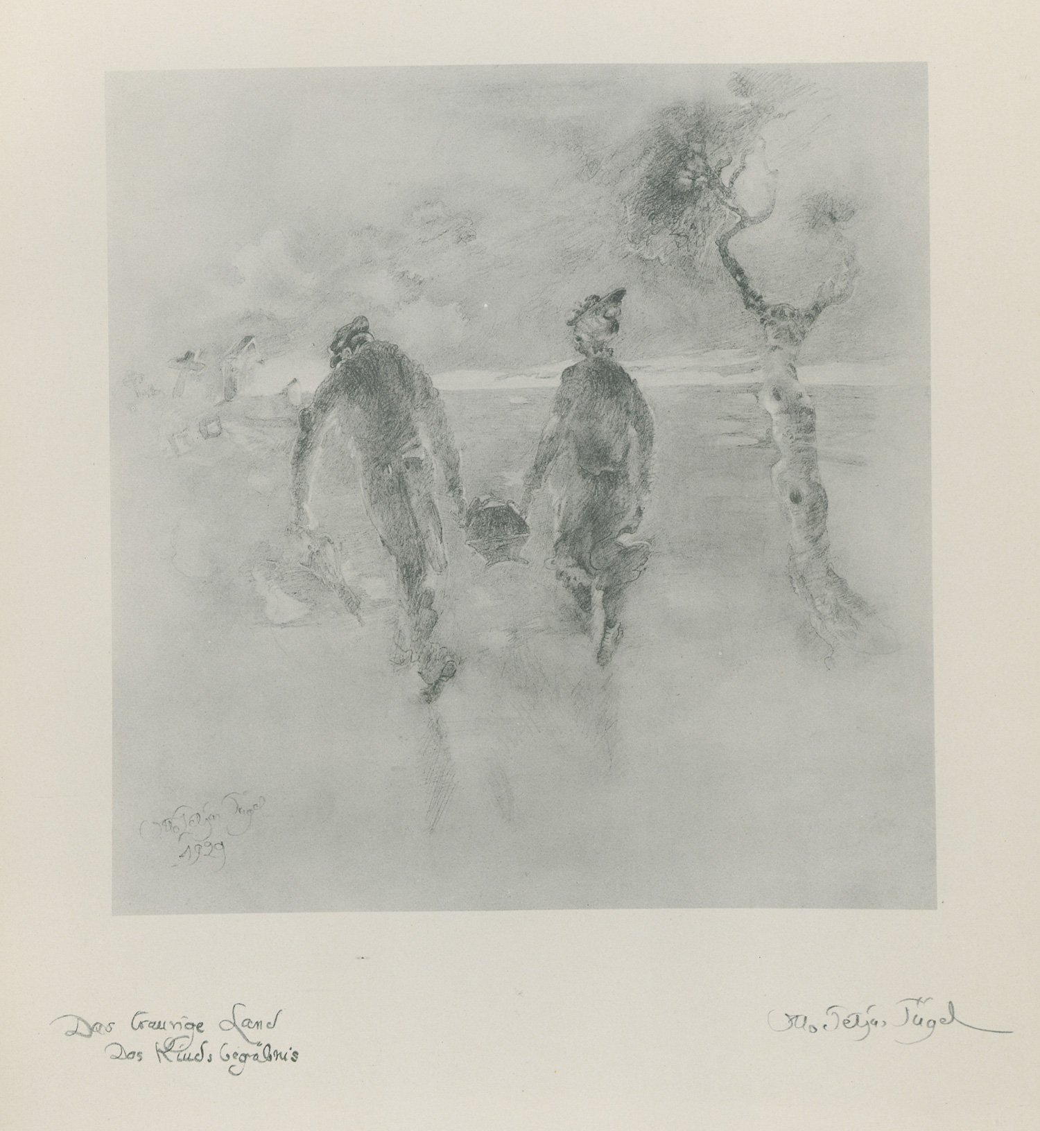 Tügel, Otto Tetjus. Das traurige Land. 20 Bleistiftzeichnungen. 22 Bl. Mit 20 blattgr. Faksimiles nach Zeichnungen. 33 x 27,5 cm. OLeinen (etwas braunfleckig und berieben). Hamburg, Quickborn, (1931).