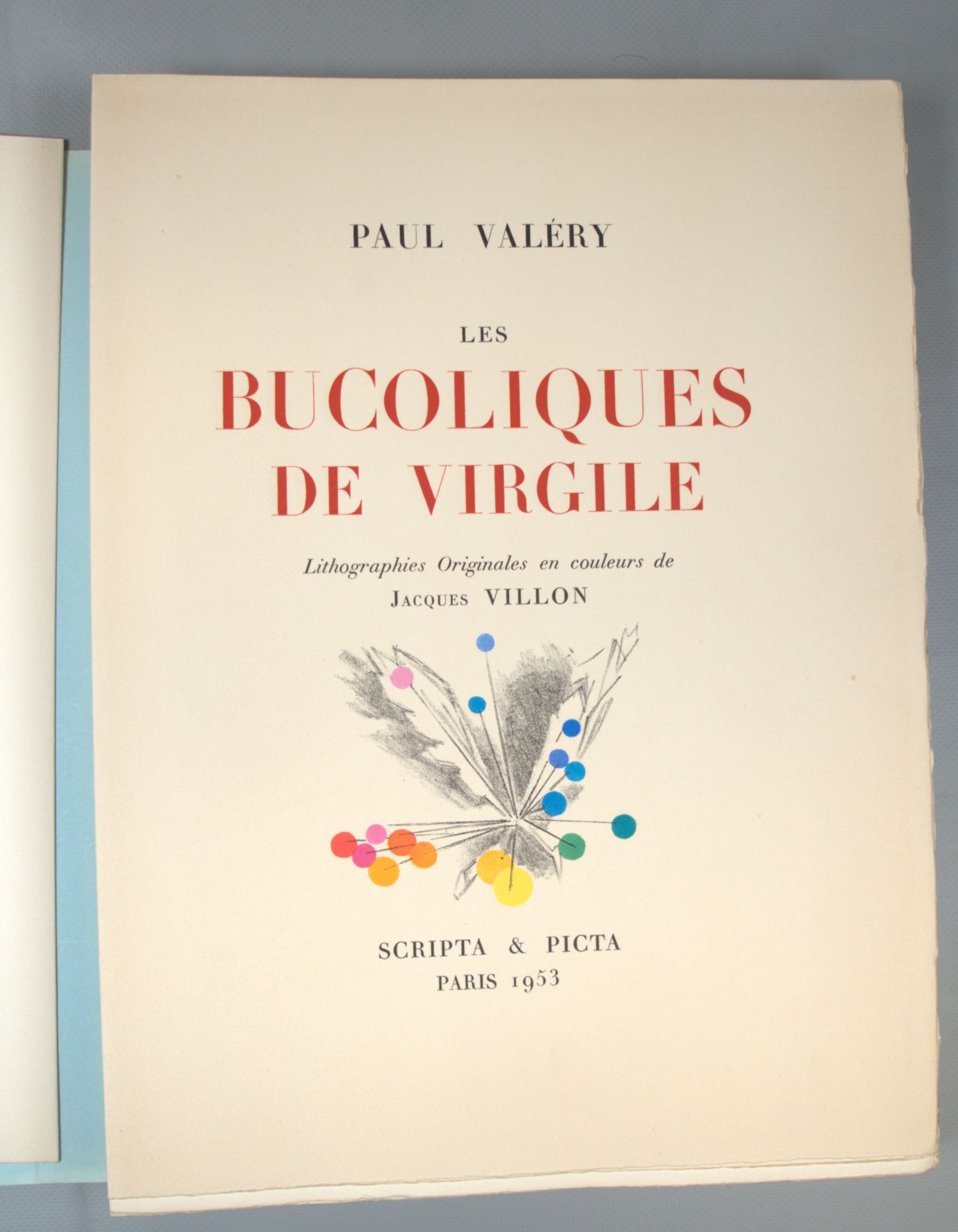 Villon, Jacques. - Valéry, Paul. Les Bucoliques de Virgile. XXXI, 127 S., 4 Bl. Mit 45 (davon 44 farbig) Orig.-Lithographien von Jacques Villon. 38 x 28 cm. Lose Doppelbogen in OKart.-Deckel mit goldgepr. Deckeltitel in OPappdecke mit goldgerp. RTitel und OPapp-Schuber (etwas bestoßen). Paris, Scripta & Picta, 1953.