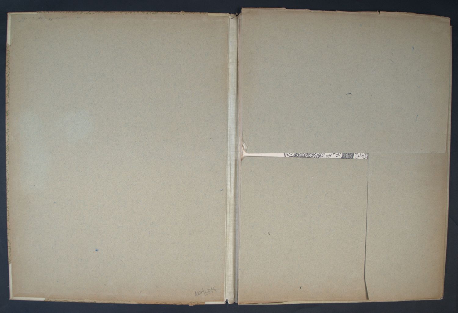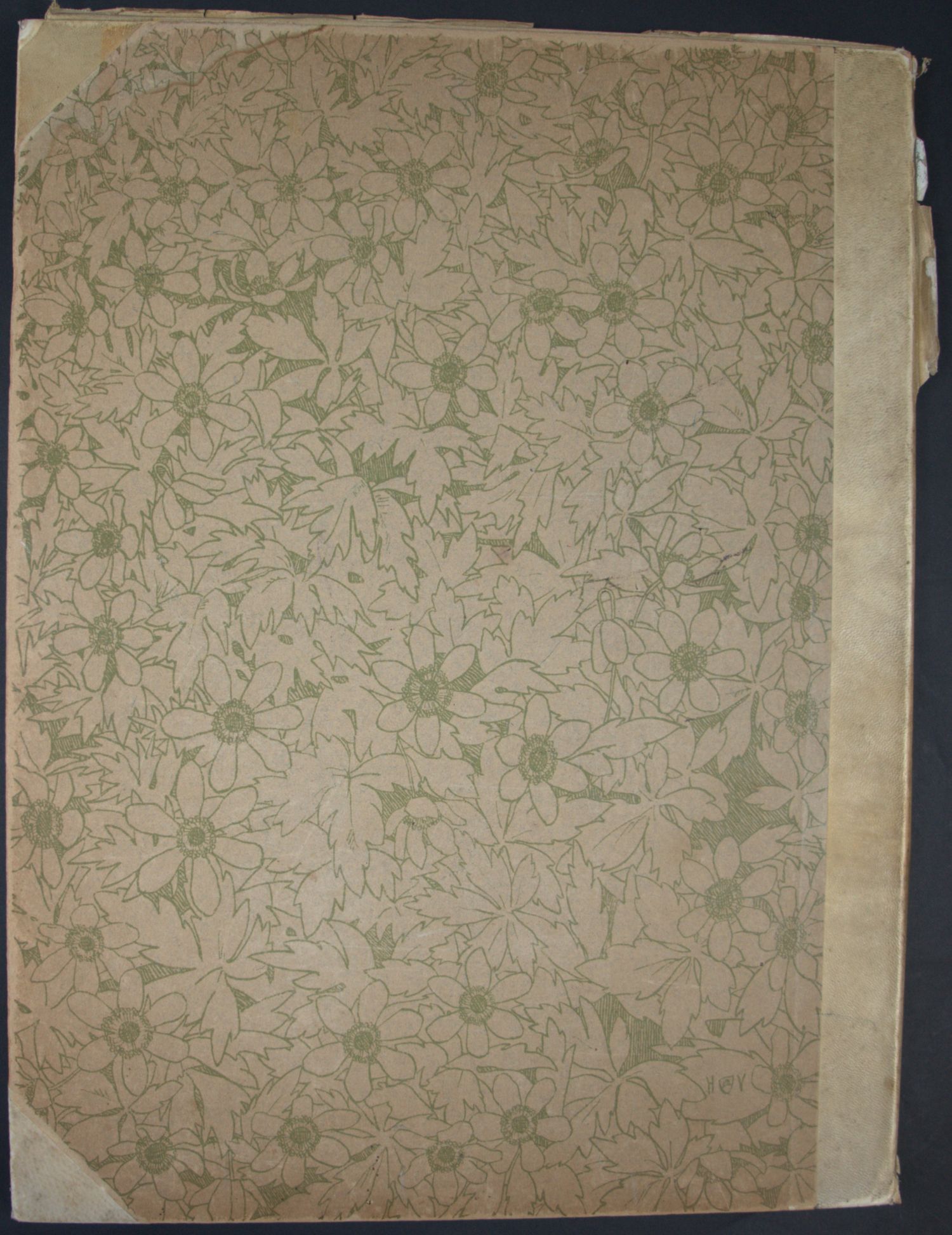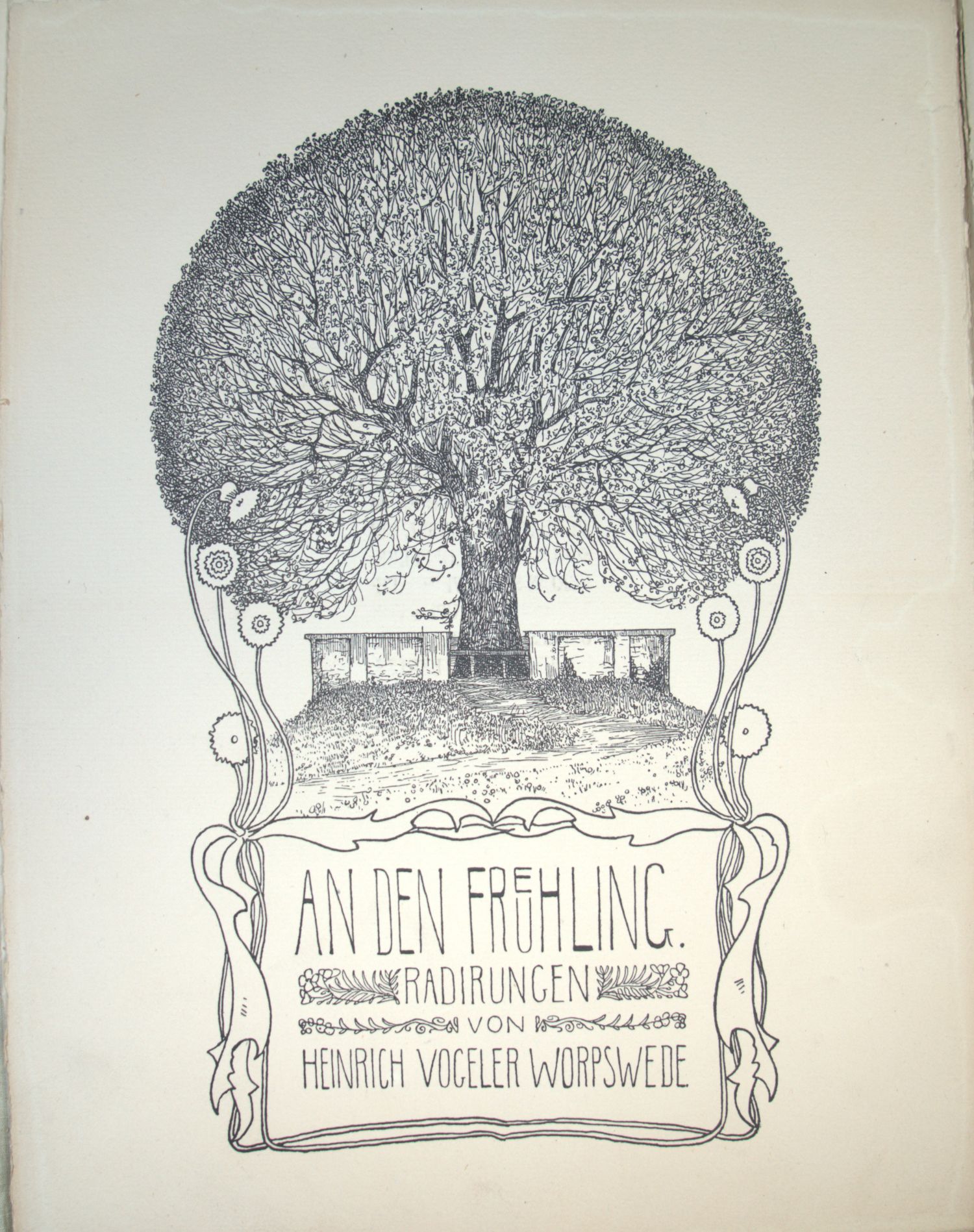 Vogeler, Heinrich. An den Frühling. Titelblatt und 10 Original-Radierungen auf festem Van-Gelder-Büttenkarton. Radierungen ca. 16 x 15 cm (Plattenrand). Format ca. 28 x 24,5 cm (Blattgröße). Lose Tafeln in OHalbpergament-Mappe (Rücken stärker lädiert, teils offen, mit Fehlstellen, angestaubt und fleckig, beschabt und bestoßen sowie berieben) mit montiertem Deckelschild auf von Vogeler entworfenem und signierten ("HV") floralen Buntpapier. Leipzig, Insel, (1899).