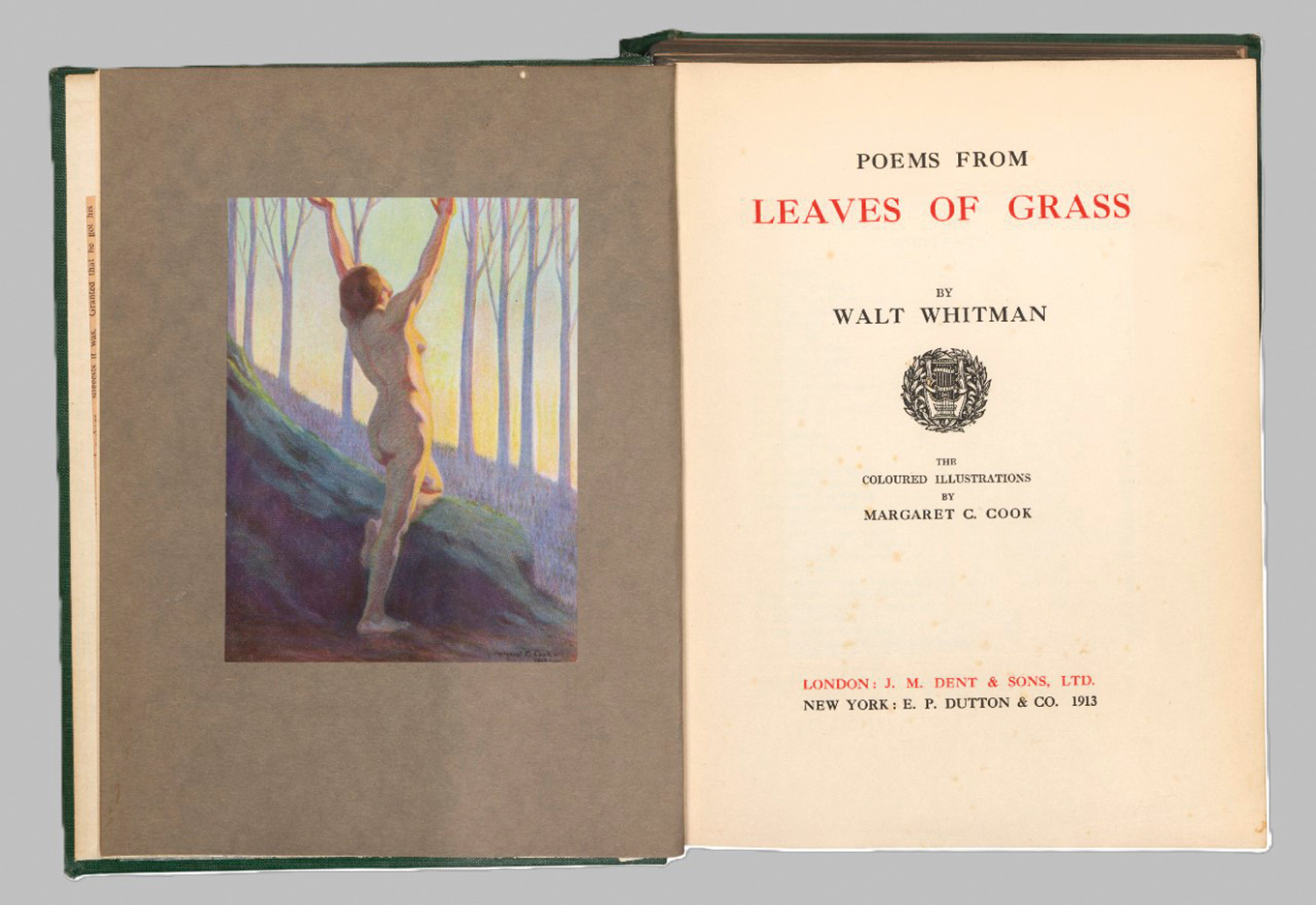 Whitman, Walt. Poems from Leaves of Grass. 260 S. Mit 25 mont. farb. Illustrationen von Margaret C. Cook. 26,5 x 20 cm. Illustr. OLeinenband (berieben und etwas bestoßen). London u. New York, Dent bzw. Dutton, 1913.