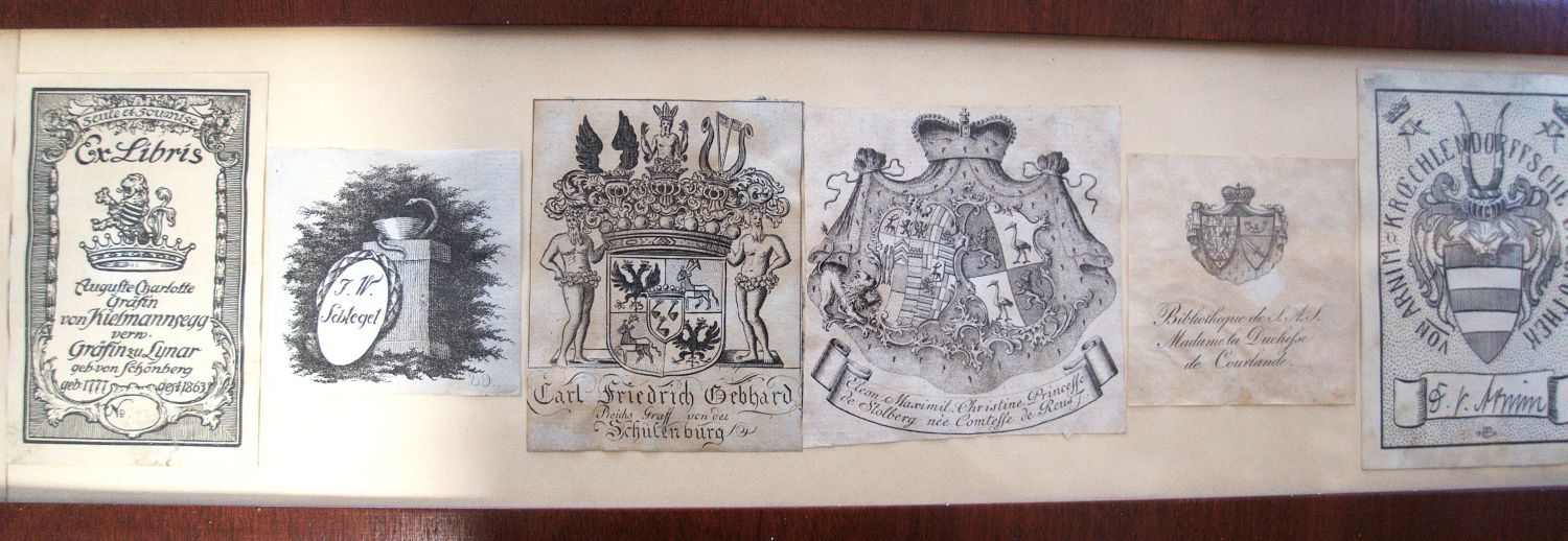Exlibris. - Sammlung von 23 gestochenen und geschnittenen Exlibris. Unter Glas gerahmt in schlichter Holzleiste. Je 15 x 67 cm. Deuschland 19. bis frühes 20. Jahrhunderts.
