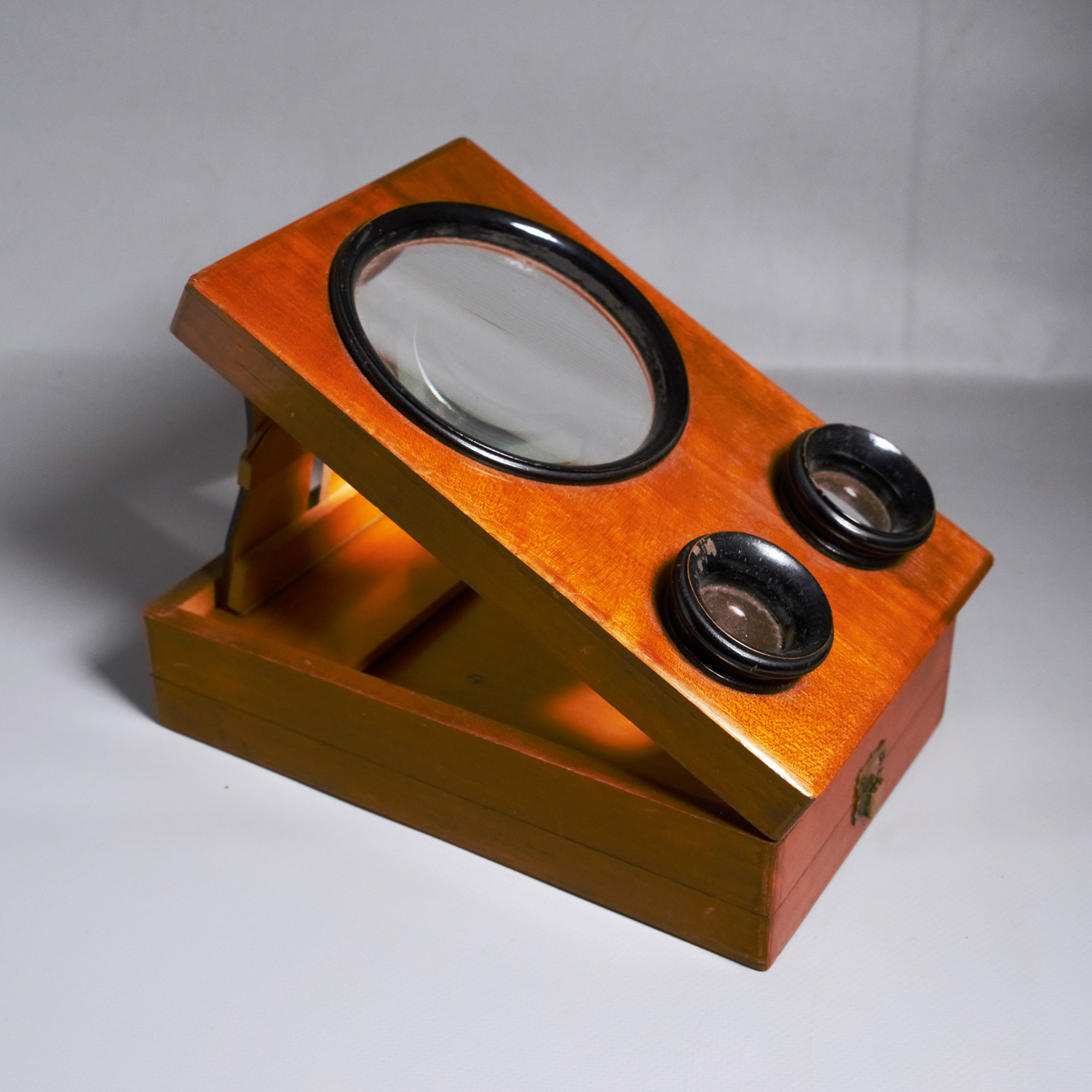 Graphoskop. Stereo-Bildbetrachter. Furnierter, aufklappbarer Holzkasten. Frontseite mit zwei kleinen Optiken zum Betrachten sowie einer großen Stereoskop-Glaslinse. 14 x 22 x 7 cm. Ende 19. Jahrhundert.