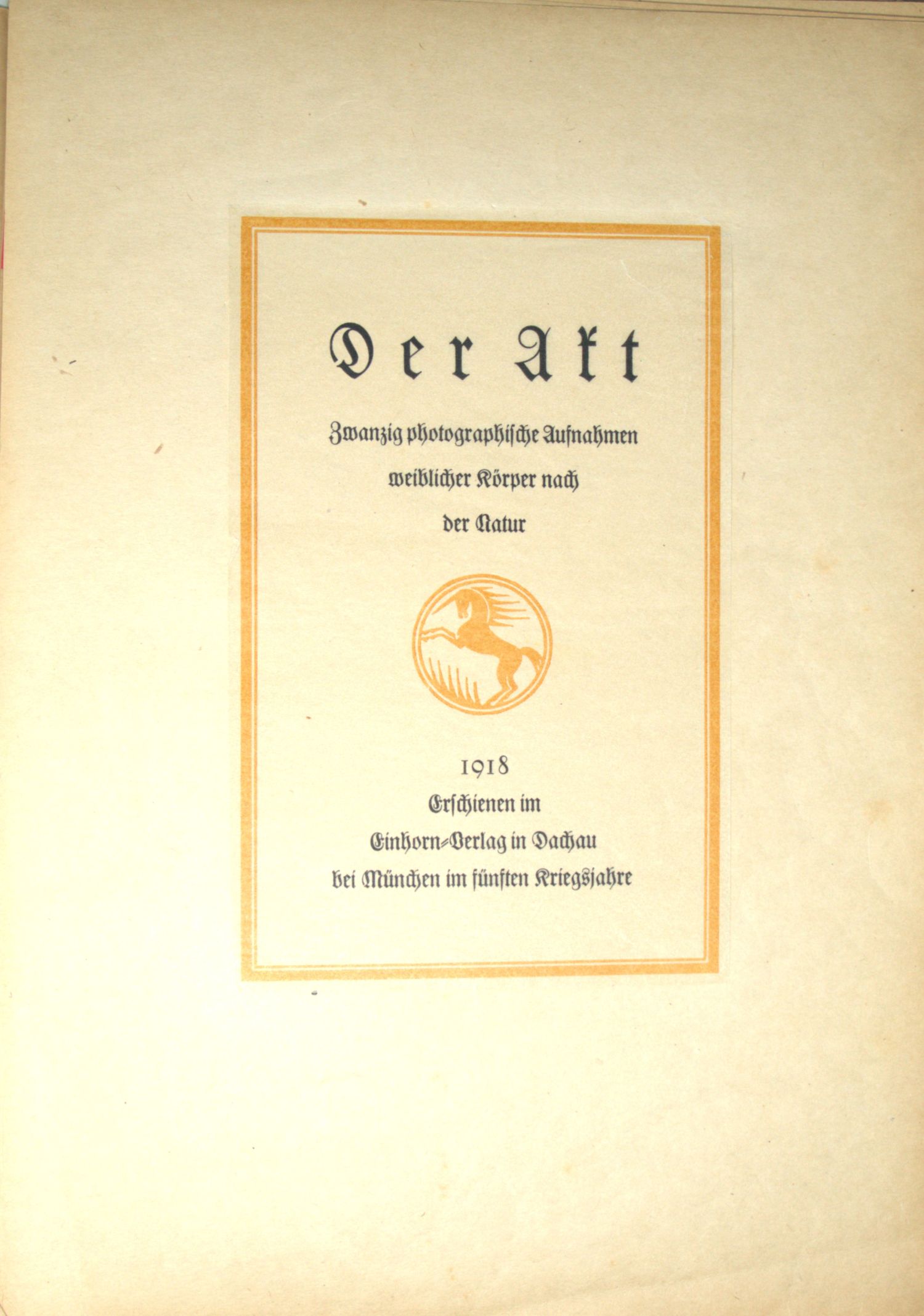 Krull, Germaine. Der Akt. Zwanzig photographische Aufnahmen weiblicher Körper nach der Natur. Titel, Inhalt und 20 Photogravüren. 40 x 30,5 cm. Lose Blatt in privater Halbleinenmappe. Dachau, Einhorn, 1918.