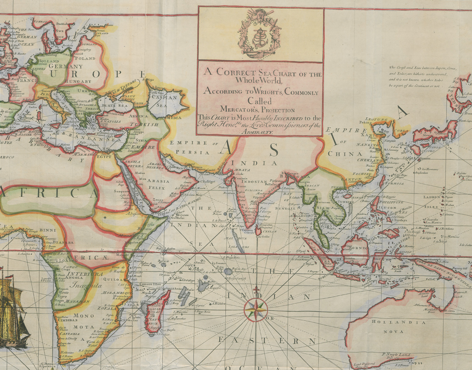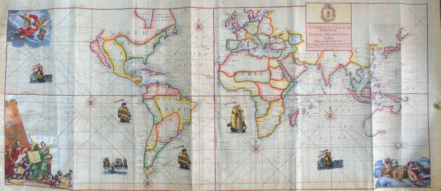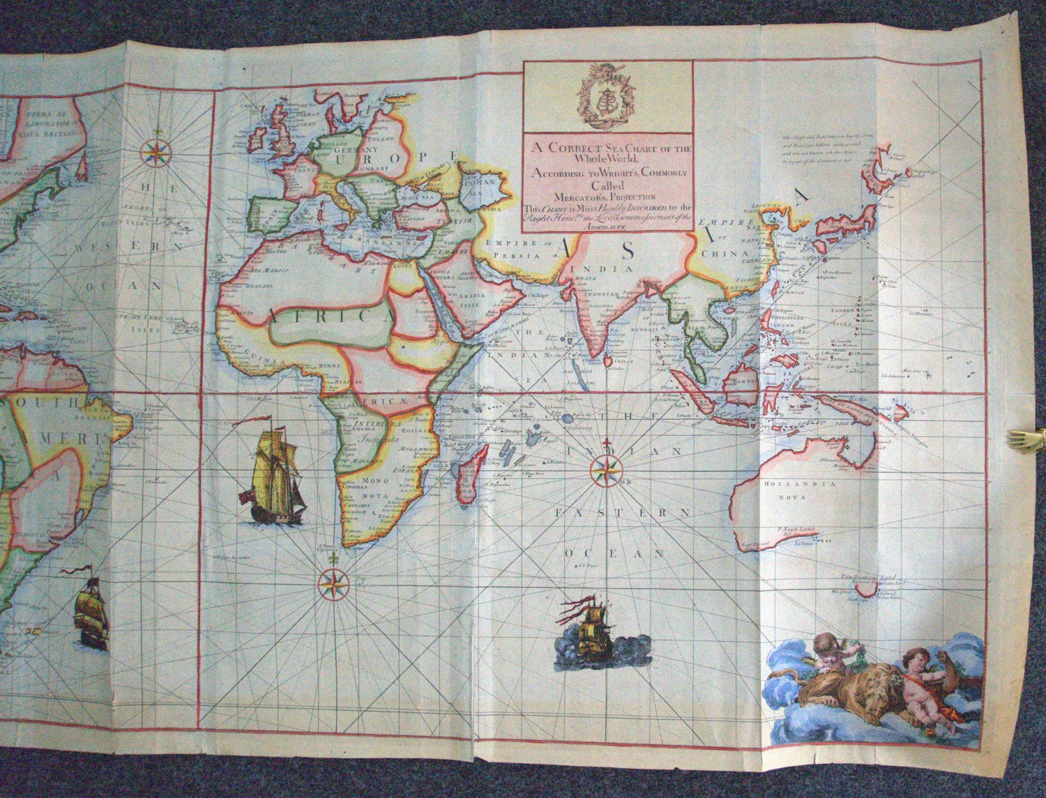 Senex, John. A correct sea chart of the whole world, according to wright's, commonly called Mercator's Projection. Kolorierte Kupferkarte von zwei Platten gedruckt und mit montierten kolorierten Kupferstichfragmenten. London, J. & J. Knapton, 1728.