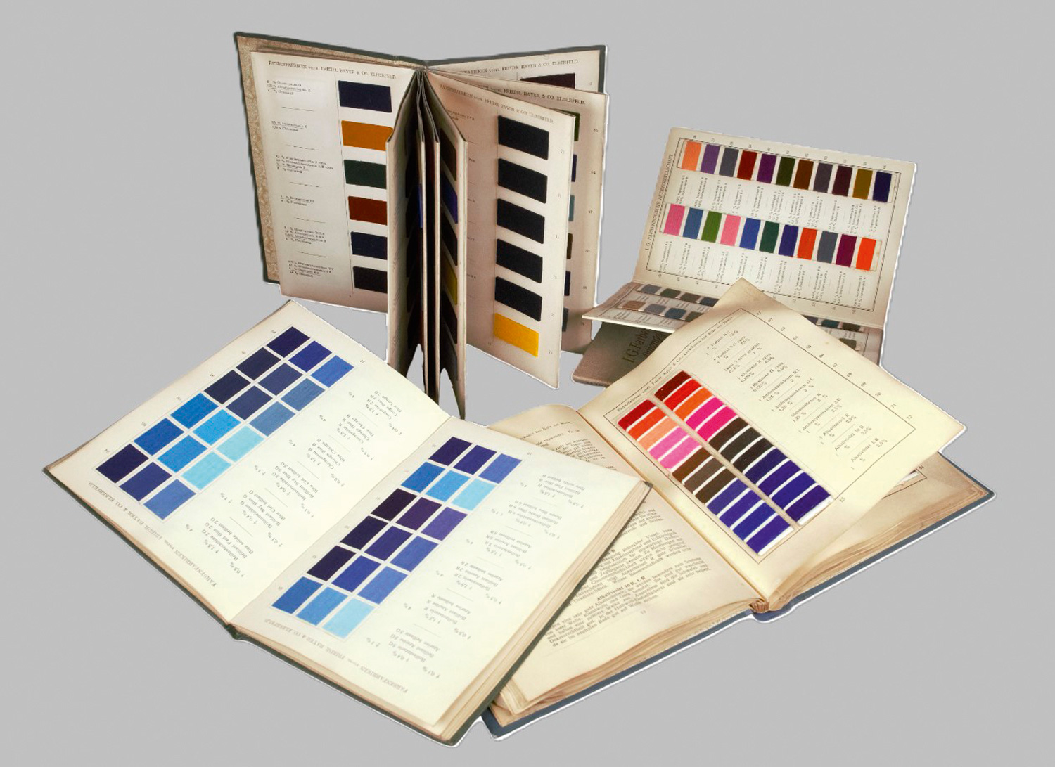 Vorhanden sind: I. Saure und basische Farbstoffe auf Wollgarn. 35 S. Mit zahlreichen Farbmustern auf Wollgarn. o. J. (wohl 1906). - II. Echte Färbung auf loser Wolle. 1 Bl., 17 S. im Leporello. Mit zahlreichen Farbmustern auf Garn. 1906. - III. Benzidinfarben auf Baumwollstückware. In deutscher, englischer und französischer Sprache. 3 Bl., 28 S. Mit zahlreichen Farbmustern auf Garn. 1907. – Teils papierbedingt gebräunt und gewellt, mit kleinen Gebrauchsspuren, insgesamt wohlerhalten. – Dabei: I. G. Farbenindustrie Aktiengesellschaft. Supramin- und Radiostoffe auf Wollgarn. In deutscher, englischer und französischer Sprache. 8 Bl. Mit 5 Tafeln mit zahlreichen Farbmustern auf Garn im Leporello. 20,5 x 14,5 cm. OLeinen (leicht berieben) mit Rück- und DTitel. Frankfurt um 1907.
