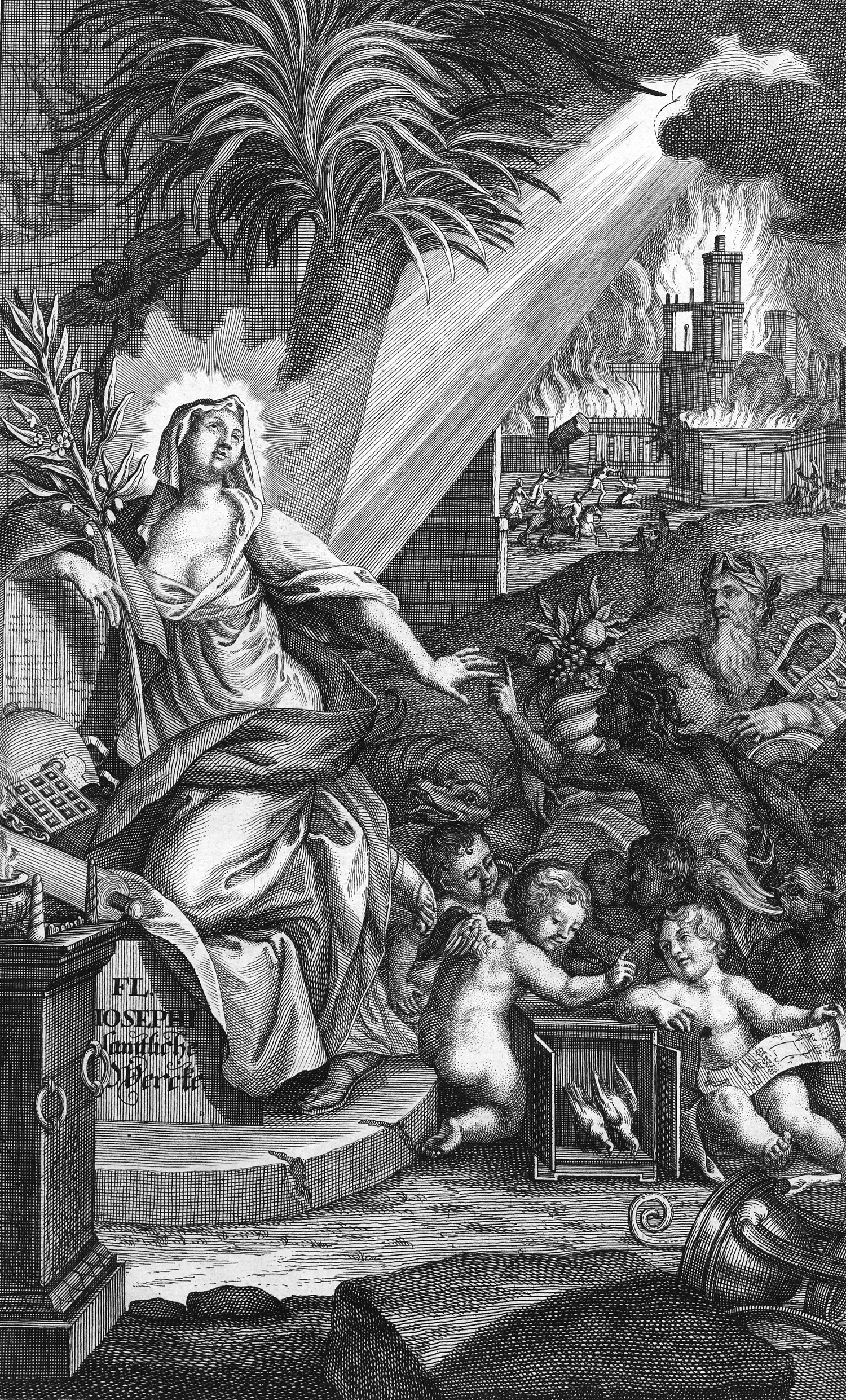 Josephus, Flavius. Sämmtliche Wercke, als zwantzig Bücher von den alten Jüdischen Geschichten ... Mit vielen Anmerkungen, wie auch accuraten Registern versehen und ausgefertiget von Johann Friedrich Cotta. 3 (statt 4) Bl., 735 S.; 212 S.; 178 S.; 34 S. Titel in Schwarz und Rot. Mit Kupfertitel, 8 (1 gefaltet) Kupfertafeln und gefalteter Kupferstichkarte. 35 x 24 cm. Leder d. Z. (stark berieben) mit schlichter RVergoldung und goldgeprägtem RSchild. Tübingen, Johann Georg Cotta, 1736.