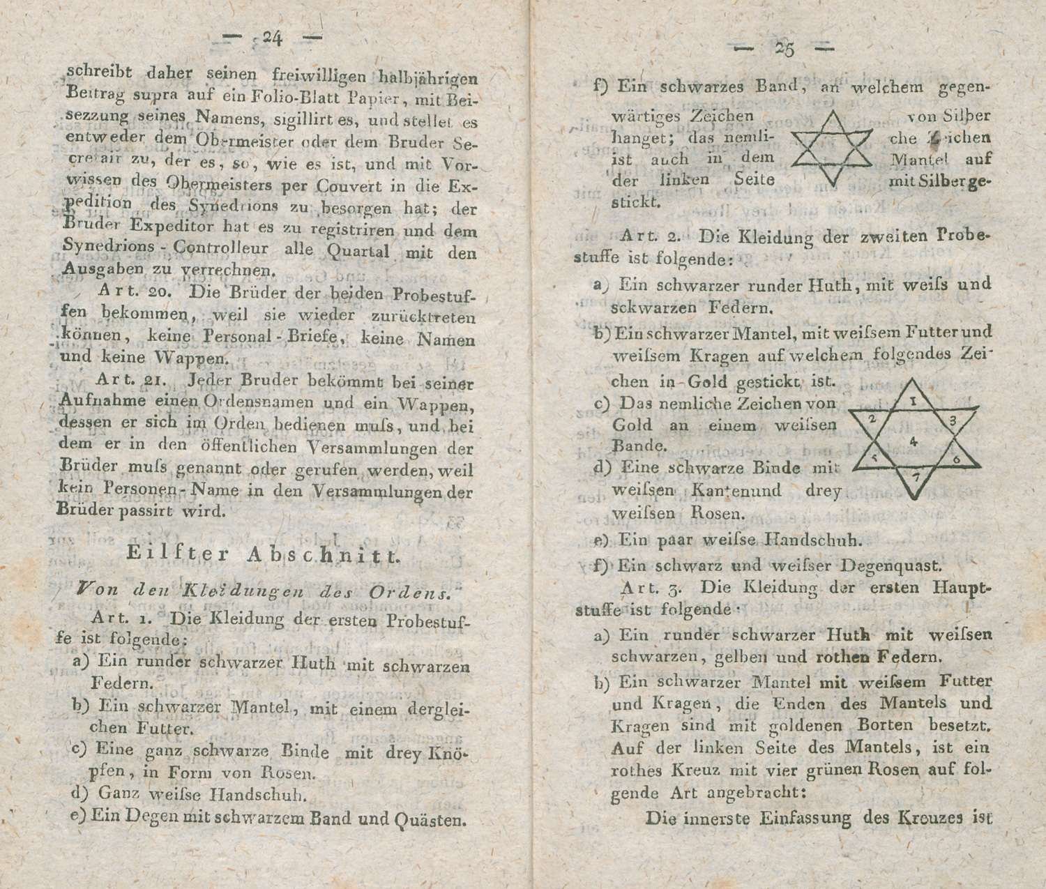 Die Brüder St. Johannis des Evangelisten aus Asien in Europa oder die einzige wahre und ächte Freimaurerei nebst einem Anhange die Fesslersche kritische Geschichte der Freimaurerbrüderschaft und ihre Nichtigkeit betreffend von einem hohen Oberen. XVI, 382 S., 1 Bl. Mit einigen Textholzschnitten. 17,5 x 10 cm. Schwarz gestrichener Pappband d. Z. (bestoßen) mit 2 RSchildern. Berlin, Johann Wilhelm Schmidt, 1803.