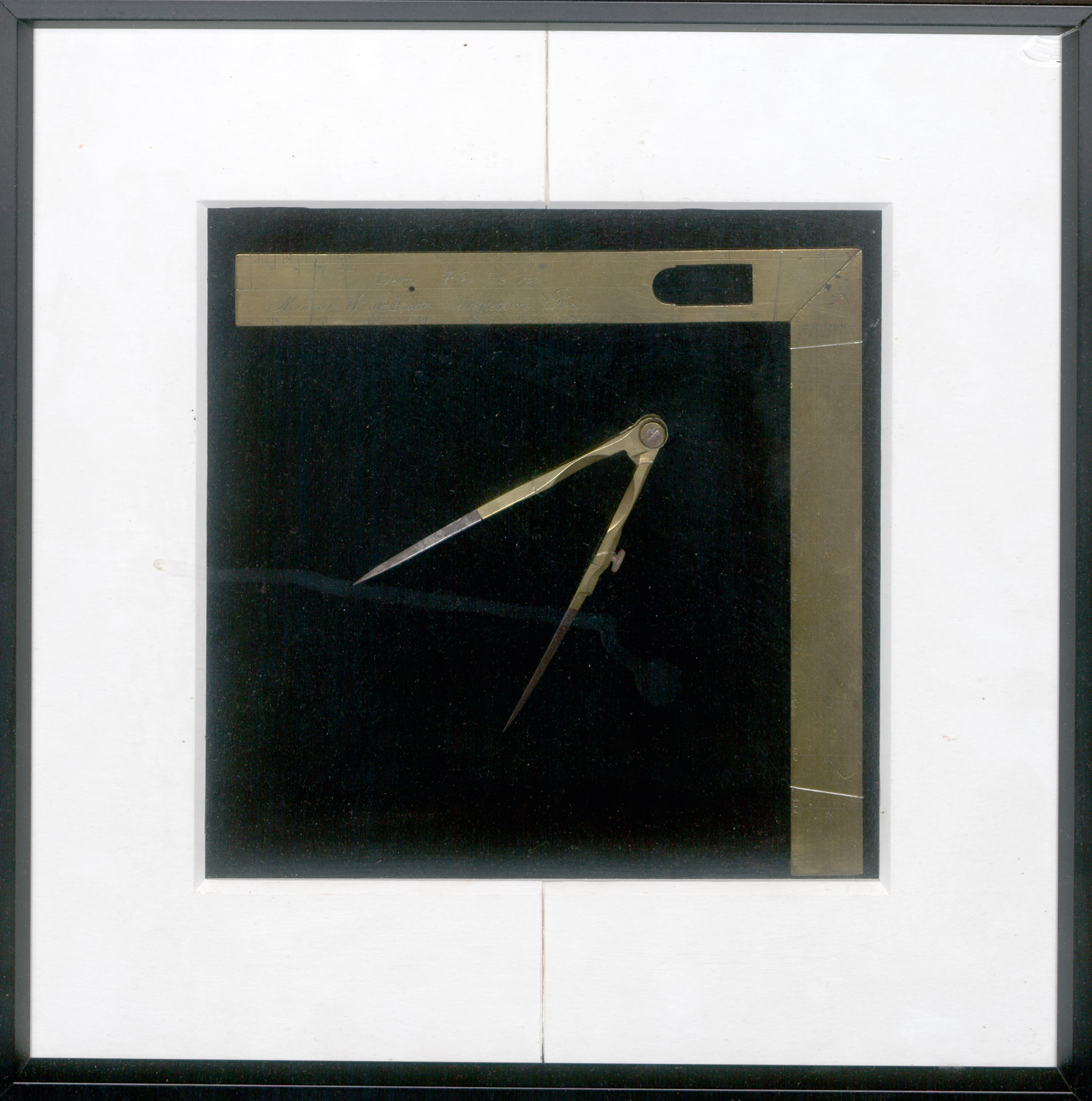 Winkelmaß und Zirkel. Geschmiedetes, teils graviertes massives Messing (Winkel) bzw. Messing mit Stahlschenkeln (Zirkel), beide mit Bändern montiert auf Samt und gerahmt. Winkelmaß ca. 17,7 x 17,7 (je Schenkel) und Breite ca. 2,2 cm; Tiefe, ca. 0,2 cm. Zirkel mit Drehknopf und Adjustierungsschraube sowie Stahlschenkeln, ca. 10 cm, Tiefe ca. 0,4 cm. Mit weißem Passepartout unter Glas in schwarzem Metallrahmen 31 x 31 cm. Paris um 1780.