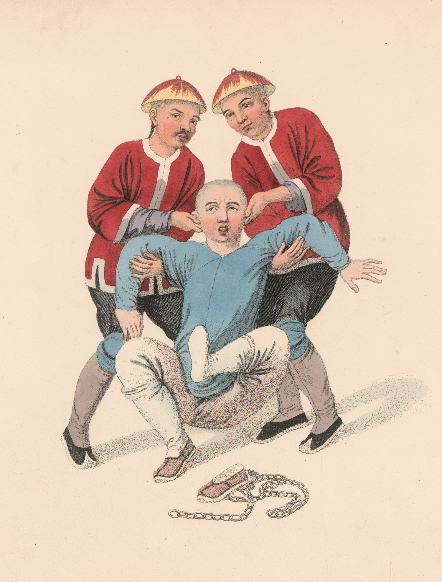 Hiler 575. Lipperheide Le 19. Vgl. Colas 2010 – Dritte Ausgabe des zuerst 1801 erschienenen Werks über körperliche Straf- und Foltermethoden in China, darunter Bastonade, Ohrenzwicken, Fingertortur, Durchschneiden der Sehnen usw. Mit englisch-französischem Paralleltext. – Eine Tafel im weißen Rand beschnitten. Etwas fleckig, sonst wohlerhalten.