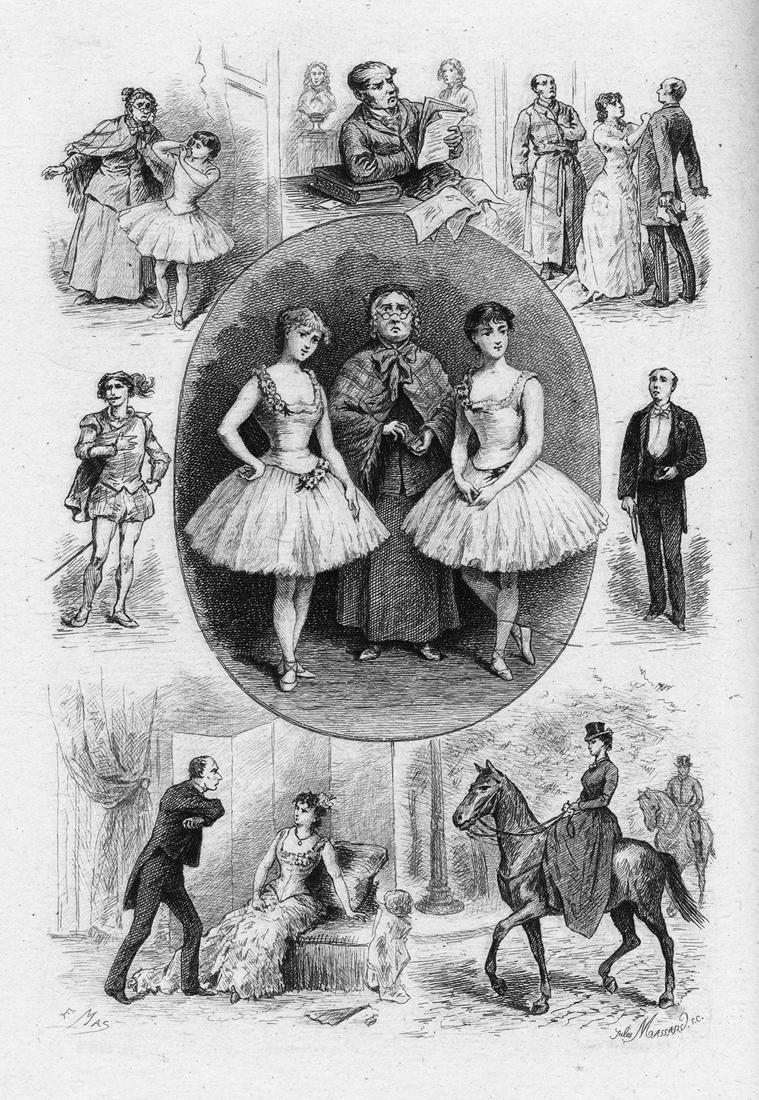 Carteret IV, 197. – Eines von 200 nummerierten Exemplaren, mit der zusätzlich beigebundenen Extrasuite der Radierungen "avant la lettre" auf Büttenpapier (vgl. Carteret; Gesamtauflage: 250) und zugleich die erste Ausgabe. Der Bühnenautor, Dramatiker und Librettist Ludovic Halévy (1834-1908) beschreibt darin eine dem Pariser Bürgertum entstammende Familie, die er als pedantisch, prunksüchtig und bösartig charakterisiert. "L’ouvrage le plus rare" (Carteret). – Vorderer Vorsatz mit ledernem goldgeprägtem Wappenexlibris. Breitrandiges wohlerhaltenes Exemplar.