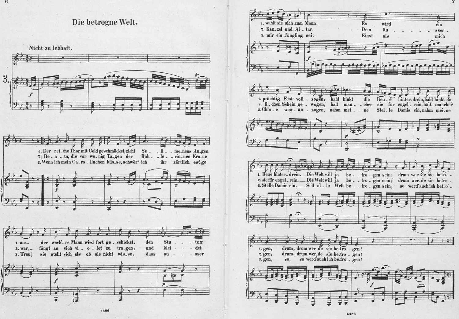 Vorhanden: G. F. Händel. Das Alexanderfest. Oratorium. HLwd d. Z. Braunschweig, Litolff, o. J. - Vorsatz mit handschriftlichem Besitzvermerk "Fanny Hensel". - W. A. Mozart. Lieder für eine Singstimme mit Pianofortebegleitung. HLwd d. Z. Leipzig, Peters, o. J. - Vorsatz mit handschriftl. Besitzvermerk "Fanny Hensel". - J. J. Ph. Spitta. Psalter und Harfe. Erste Sammlung christlicher Lieder. 27. Aufl. Lwd d. Z. mit Goldprägung und Goldschnitt. Leipzig 1864. - Vorsatz mit eigh. Widmung von Minna Hensel (5.IV.1865). - Sammelband mit 10 Kompositionen, darunter 2 von Fanny Hensel: 6 Lieder für eine Stimme mit Begleitung des Pianoforte. 1. Heft, op.1. Berlin und Breslau, Bote & Bock, o. J. - Vier Lieder für das Pianoforte. 2. Heft, op. 6. Berlin und Breslau, Bote & Bock, o. J. - Mit hübsch gestochenem Titel. - Ferner ist enthalten: Felix Mendelssohn Bartholdy. Sechs Kinderstücke für das Pianoforte. Op. 72. Leipzig, Breitkopf & Härtel, o. J. - Vorgeheftet eine handschriftliche Widmung: "Dem Fräulein Julie Adelson zur Erinnerung gereicht am neun und zwanzigsten Februar 1848. F. T. L."