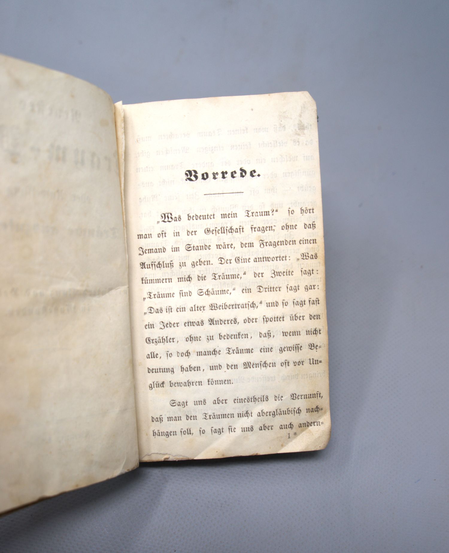 Wohl zweite Auflage. "Möge es denn recht viel zur Belustigung und Unterhaltung in freundschaftlichen Zirkeln beitragen, jedem Erzähler eines Traumes die glücklichste Auslegung und Erfüllung gewähren - und endlich auch noch Glück und Gewinn bringen durch treffende Nummern in der Lotterie" (Vorwort). – Titel gebräunt, finger- und feuchtfleckig sowie am Innensteg verstärkt. Insgesamt vereinzelt leicht stockfleckig, etwas feuchtrandig am Fußsteg, mit wenigen Randläsuren und größerer Fehlstelle bei dem zweiten Blatt mit Holzschnitten.
