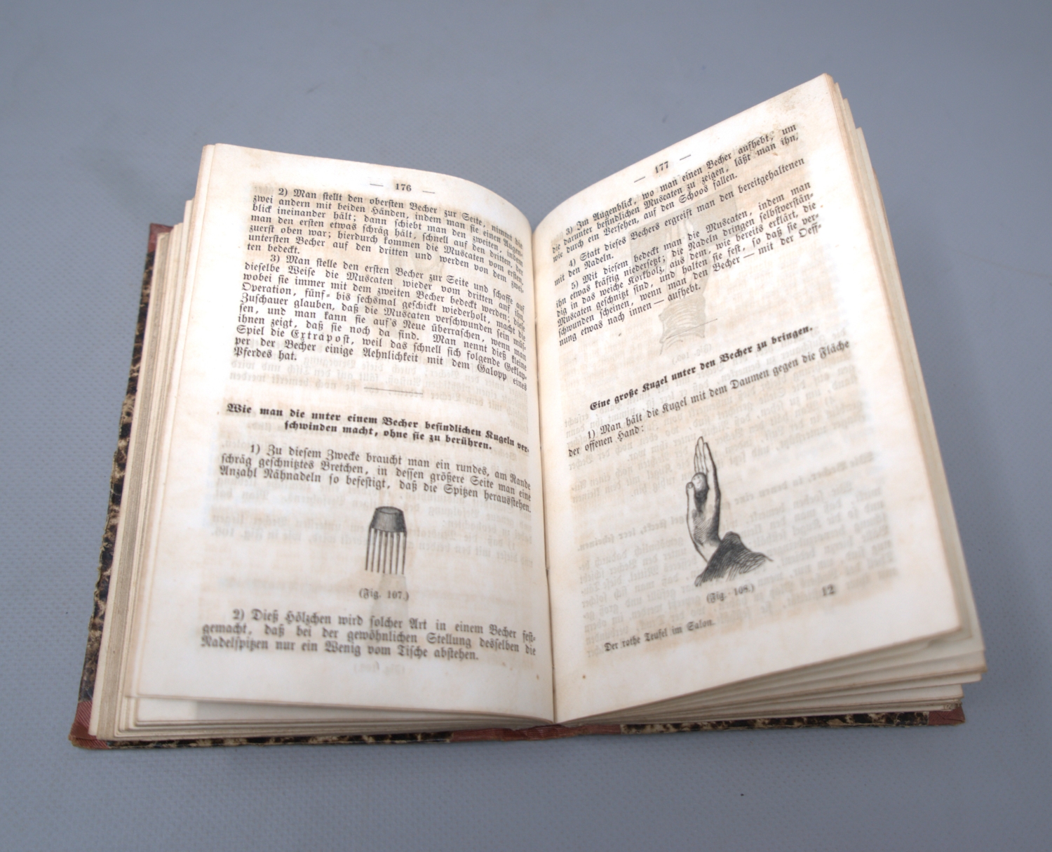Clarke-Blind 67. Volkmann 146. – Erste Ausgabe. Mit Kapiteln zur kleinen und großen Zauberkunst, zur Kunst des Escamotierens, zu Kartenkunststücken und Gesellschaftsspielen. – Mit montiertem zeitgen. Etikett auf dem Innenspiegel. Papierbedingt gebräunt, insgesamt in guter Erhaltung.