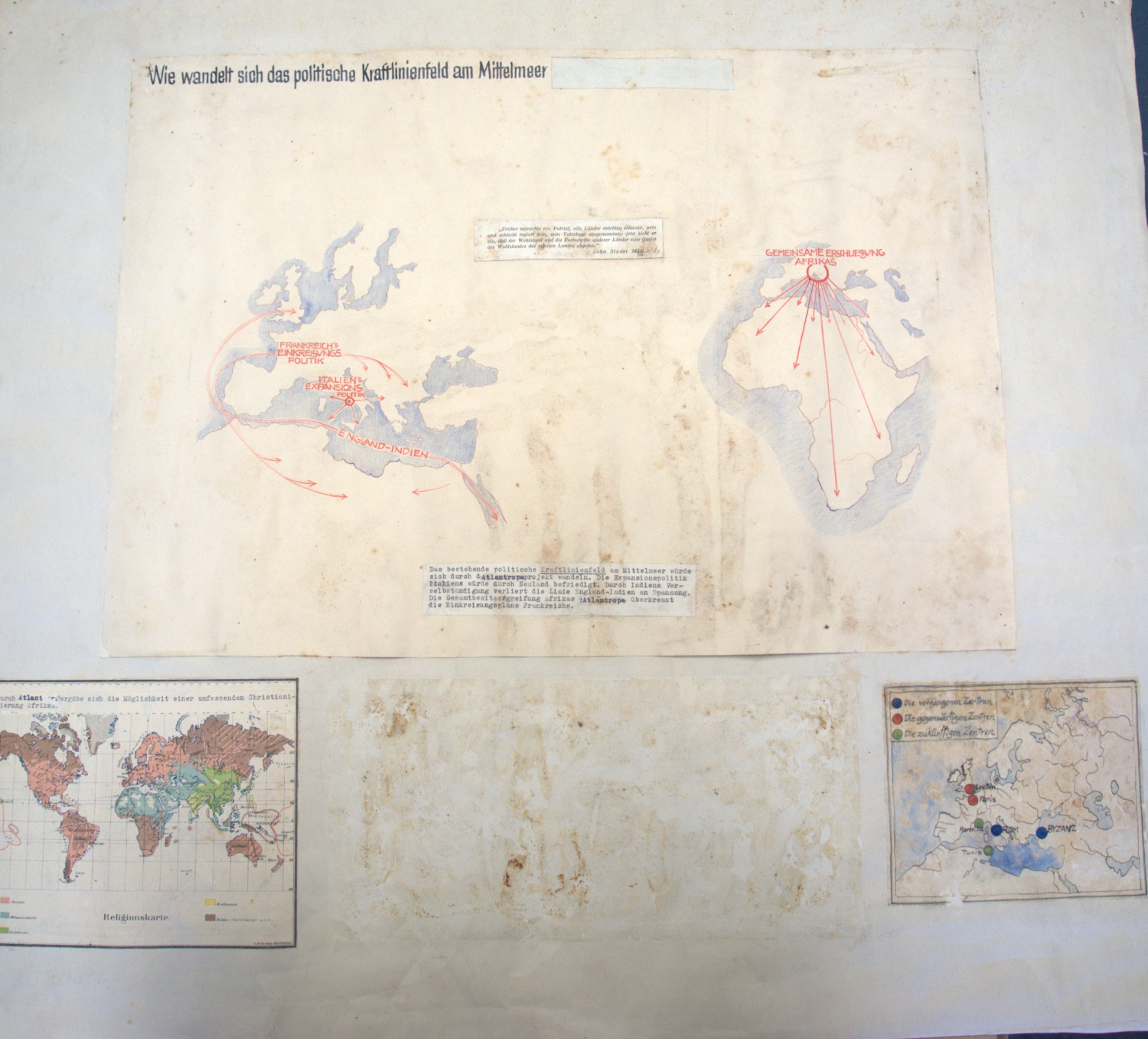 6) "Wie wandelt sich das politische Kraftlinienfeld am Mittelmeer". Karton mit 3 (von 5) Kollagen. 66 x 75 cm.