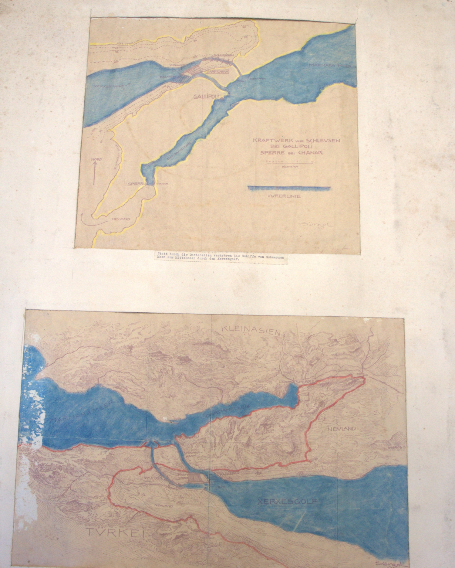 7) Herman Sörgel. Dardanellen. Passepartoutkarton mit 2 Kollagen von Herman Sörgel. 82 x 65 cm. "Kraftwerk und Schleusen bei Gallipoli. Sperre bei Chanak. Umleitung des Schiffsverkehrs in den Xerxesgolf".