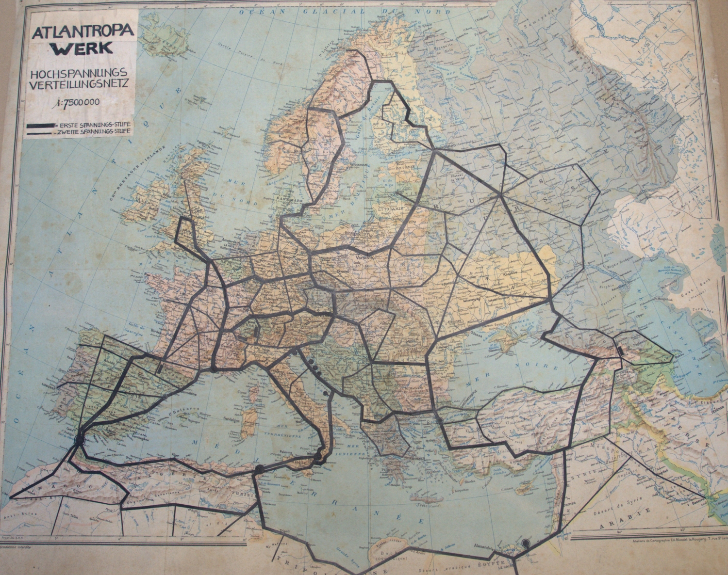 1) "Atlantropa Werk. Hochspannungs-Verteilungsnetz 1:7500 000". Farbig lithographierte Europakarte aus den Ateliers de Cartographie Ed. Blondel la Rougery, Paris. 65 x 81,5 cm. Mit Einzeichnung der Stromtrassen in Europa und Nordafrika, von Nordschweden, über Kazan und Samara, ans Kaspische Meer, den Persischen Golf, Ägypten und den Maschrek sowie den Maghreb bis dann über Spanien, Frankreich und England und kreuz und quer durch Zentraleuropa.
