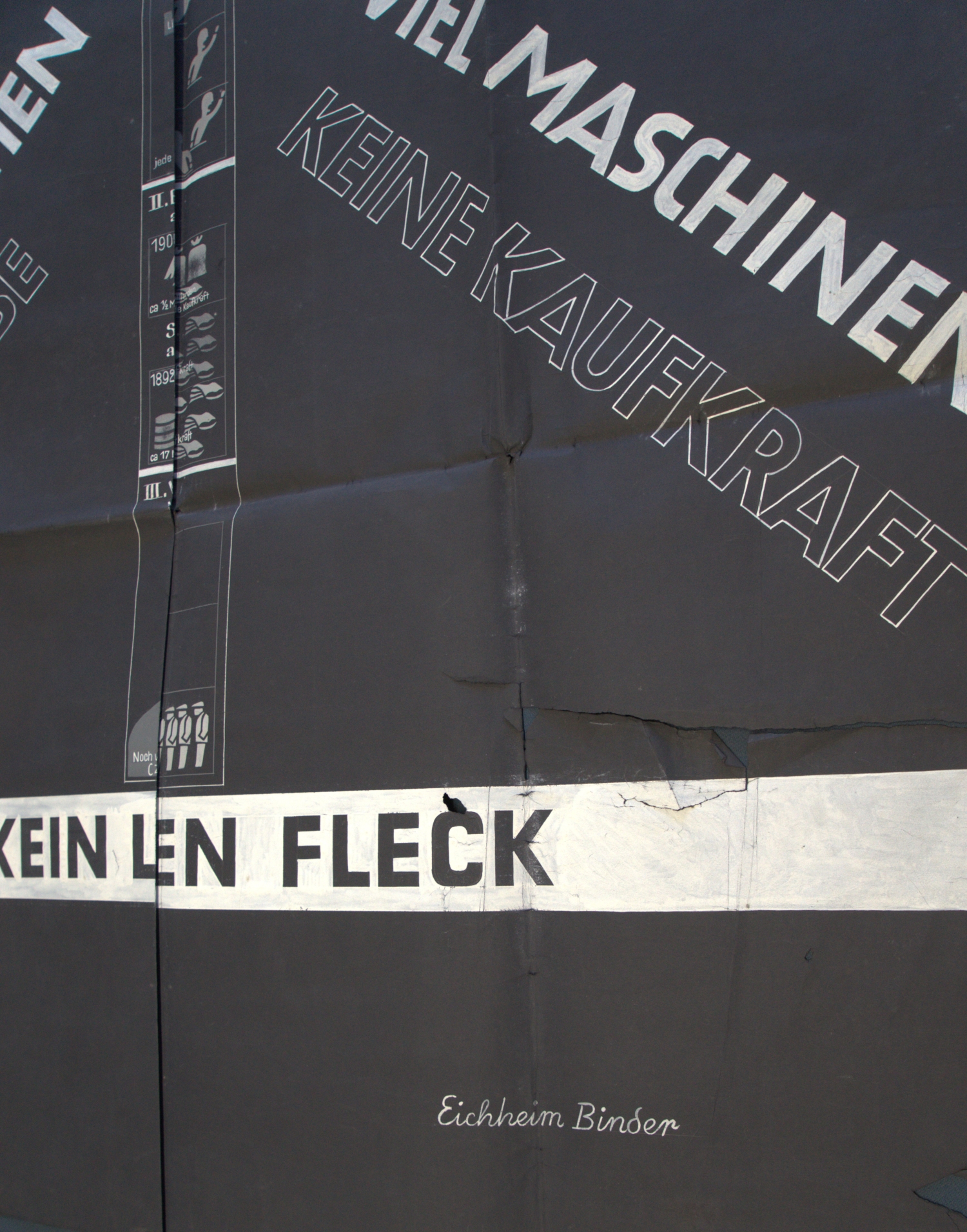 Plakative Darstellung der Menschheitsprobleme am Anfang der dreißiger Jahre aus eurozentristischer Perspektive, entstanden für die Wiener Ausstellung zu Herman Sörgels "Panropa-", dem späteren sogenannten "Atlantropa-Projekt". Das Großplakat benennt die Hauptprobleme: "Zuviel Menschen Arbeitslose - Durch den Weltkrieg wurden auf allen Gebieten ungeheuere Werte vernichtet - Zuviel Maschinen, keine Kaufkraft. Aber kein Lebensraum am rechten Fleck". Einzelne Graphiken widmen sich je einem Detailproblem: "I. Bevölkerungszunahme mit ihrem Expansionsdrang", "II. Entwicklung der Maschine in PS", "Steigerung der industriellen Rohstoffgewinnung", "III. Vergrösserung des menschlichen Aktionsradius durch die Verkehrstechnik", "Ia. Die politische Differenzierung Europas", "IIa. Überproduktion bei zu geringer Goldförderung, daraus Kaufkraft-Verlust", "IIIa. Erwerb- und Arbeitslosigkeit - Konflikt zwischen Maschine und Hand". – Rechter Rand unten mit größerem, sonst nur kleinere Einrisse (ohne Bildverlust), verso mehrere alte Klebe- und Montagespuren, mehrfach gefaltet, sonst nur mäßige Gebrauchsspuren.