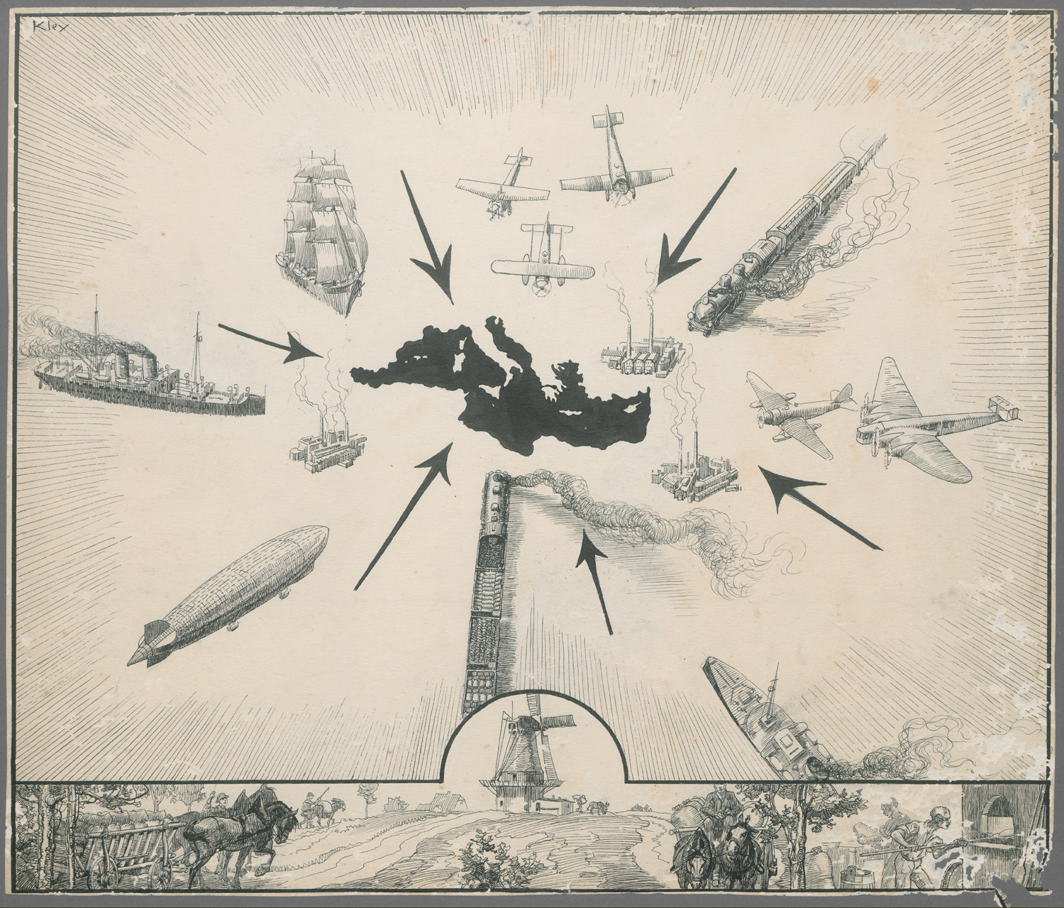 Originalzeichnungen des aus Karlsruhe stammende Zeichners und Malers Heinrich Kley (1863-1945) für das große Atlantropaprojekt Herman Sörgels. Ein Karton zeigt die historischen Voraussetzungen des Projekts, mit dem durch Austrocknung des Mittelmeeres die Kontinente von Europa und Afrika wieder vereint werden sollten, wie im alten Gondwana. Humoristisch zeigt Kley die freie Wanderung der Tiere über den einstigen Großkontinent und die mühsame Rettung derselben nach der Sintflut in der Arche Noas (Bilder I+II). Die zweite Schautafel zeigt die Strömungsbewegungen des Wasser im Atlantik: "Ausbreitung des kalten Wassers, das aus dem Mittelmeer strömt und wie ein Abwehrpolster den Golfstrom ablenkt". Sowie "Zentralheizung Europas durch den Golfstrom I., heute und II., nach Schliessung der Straße von Gibraltar durch einen Damm: Mitteleuropa bekommt ein wärmeres Klima". Ironie des Schicksals: das Eingreifen des Menschen in die Natur mit Großprojekten und Überindustrialisierung führte schon heute, nicht einmal ein Jahrhundert später zu einer thermischen Erhitzung des Kontinents und zur Veränderung des Golfstroms.