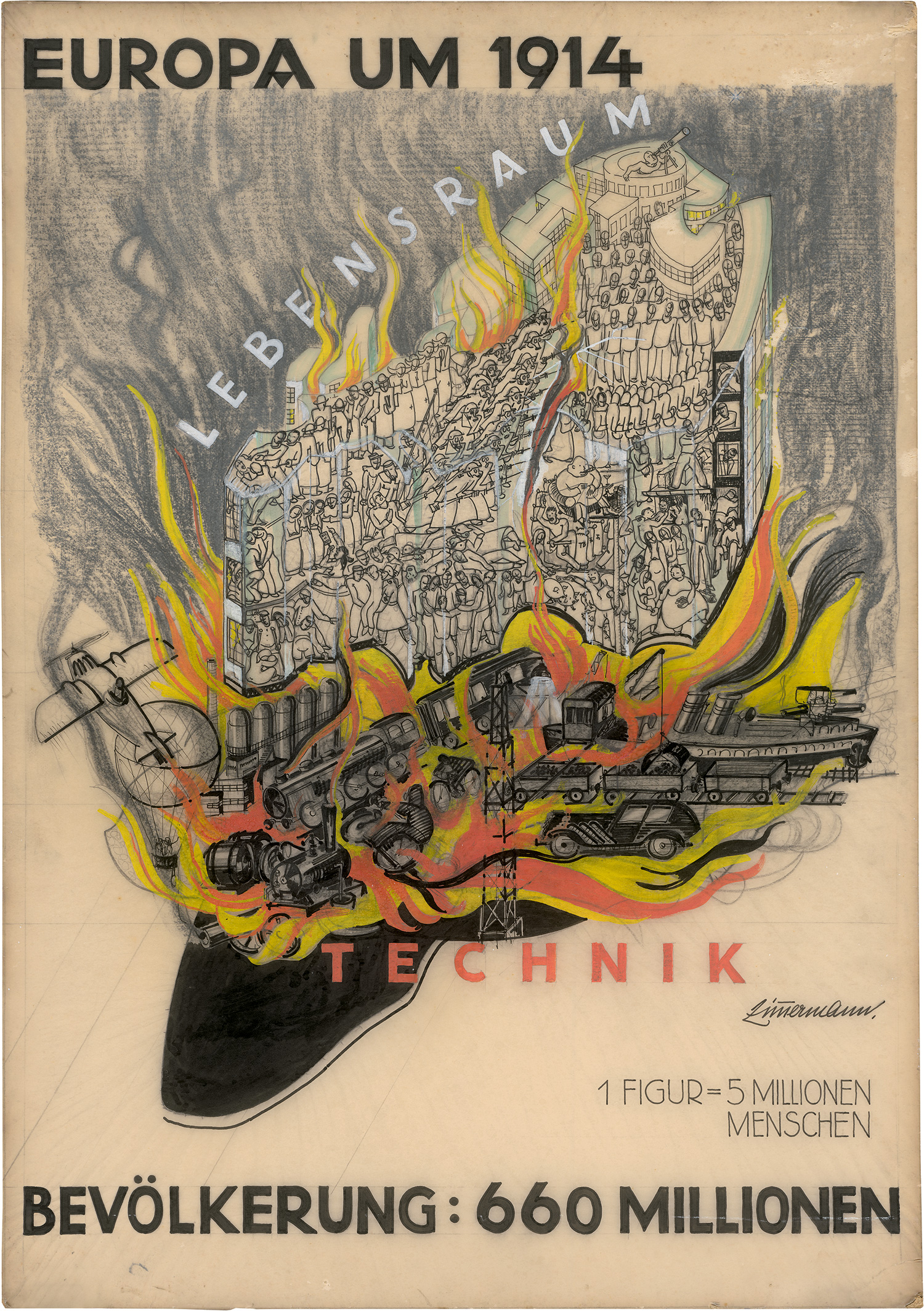 3) Europa um 1914 - Bevölkerung: 660 Millionen". Auf dem als "Lebensraum" zu klein gewordenen Kontinent Europa drängen sich dicht die Figuren als Arbeiter, Soldaten, Gläubige, Liebende, Bauern etc., eingepfercht von der "Technik", zwischen Fabriken, Eisenbahnen, Autos, Schiffen und Gebäuden der Moderne. Der Kontinent steht in Flammen, die auf Afrika übergreifen.