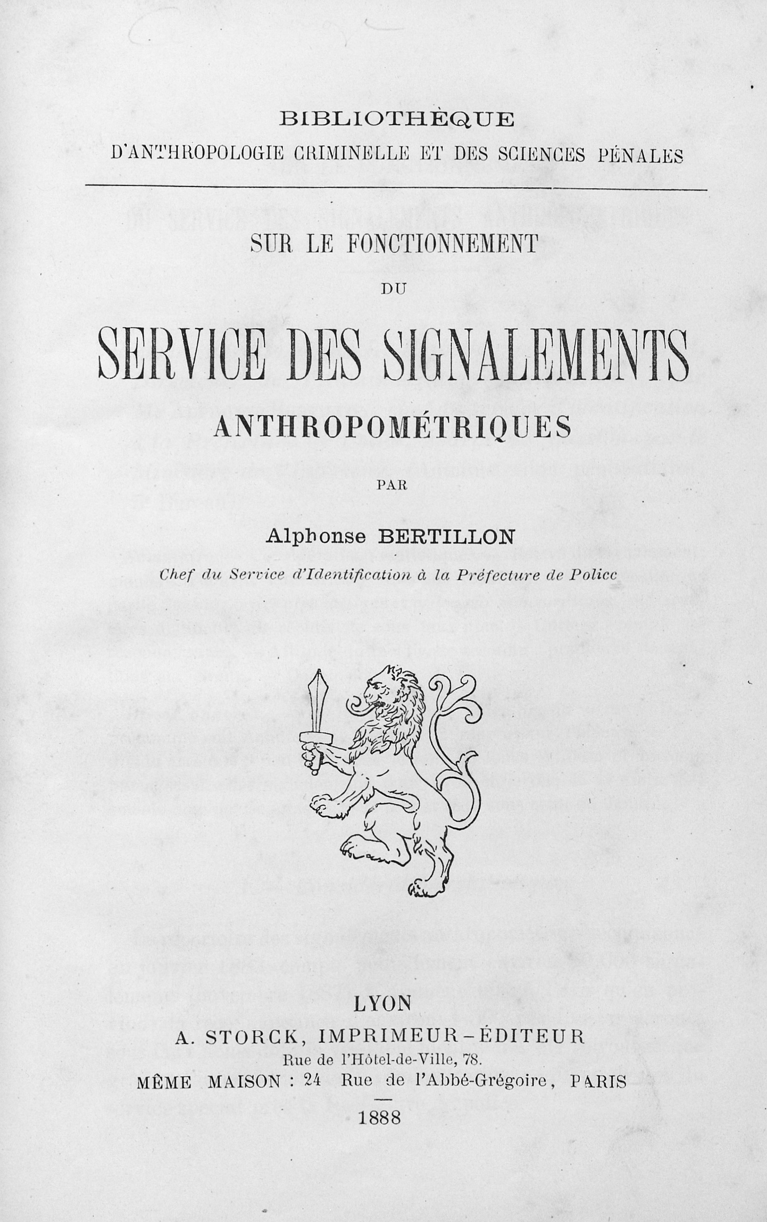 Bibliothèque d'anthropologie criminelle Erste Ausgabe. "Alphonse Bertillon veröffentlicht seine anthropometrischen Versuche zur Feststellung der Identität von Personen für die Zwecke der Strafrechtspflege, auf Grund deren zuerst in Paris, dann in den Hauptstaaten Europas ein polizeilicher Erkennungsdienst organisiert wird, wozu er auch die Anlage von Verbrecheralbums anregt" (Darmstaedter 798). – Gering gebräunt und fleckig.