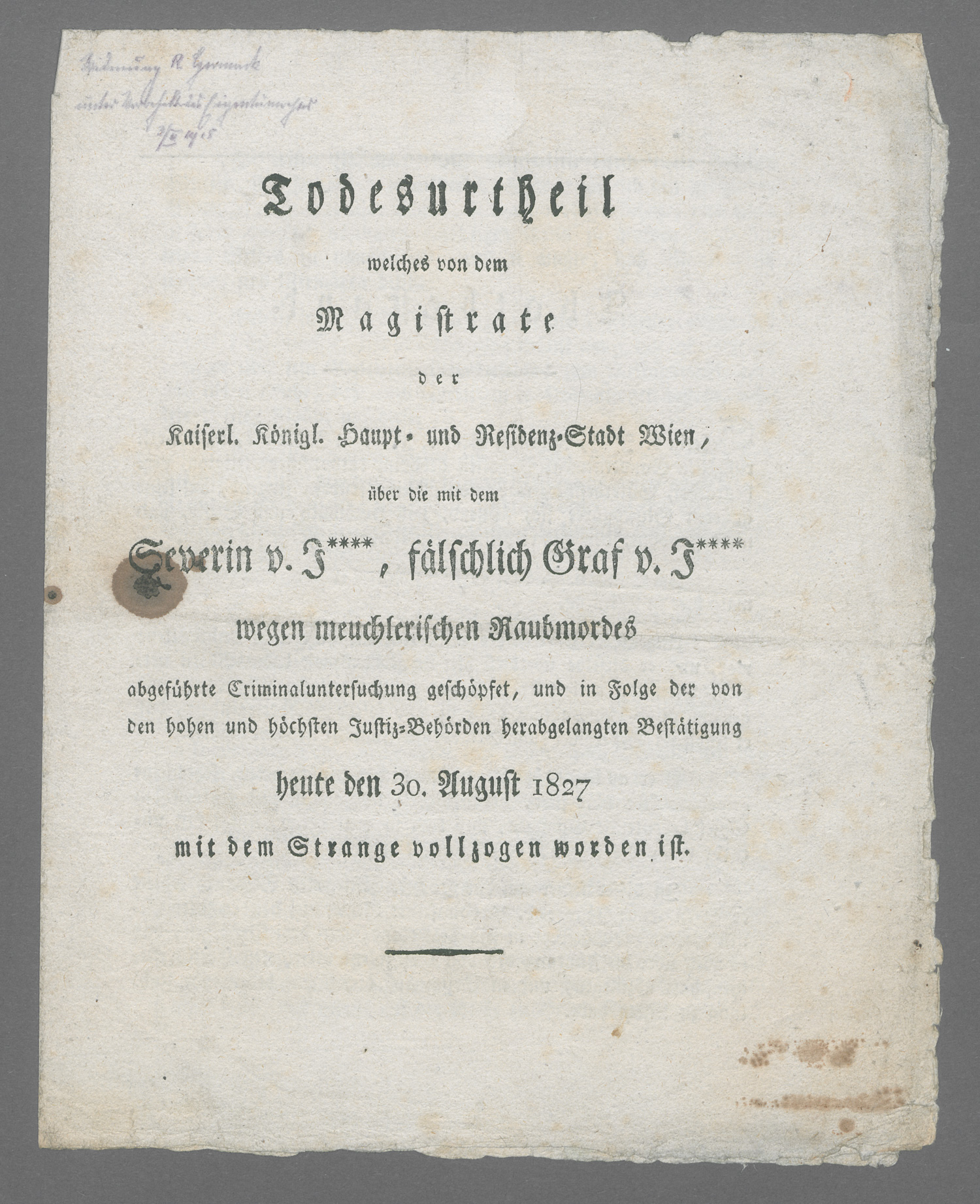Todesurtheil welches von dem Magistrate der kaiserl. Königl. Haupt- und Residenz-Stadt Wien, über die mit dem Severin v. F., fälschlich Graf v. F. wegen meuchlerischen Raubmordes ... Gefaltetes Blatt mit 4 Seiten. 26,5 x 21 cm. Wien 30. August 1827.