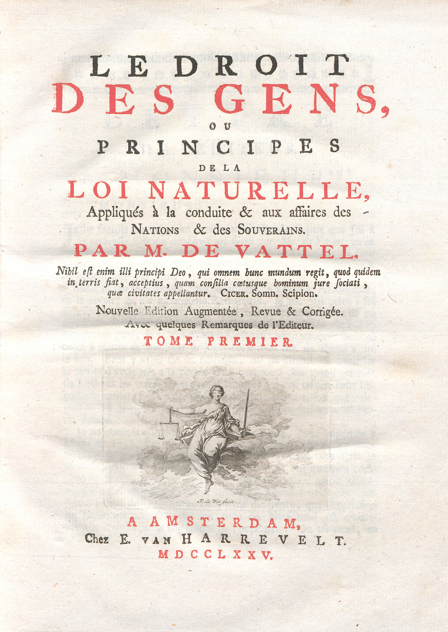 ADB XXXIX, 511. – Großzügiger Amsterdamer Quartdruck von Vattels zuerst 1758 in Leiden erschienenem Hauptwerk, das "sich durch Klarheit und Deutlichkeit der Darstellung auszeichnet... Keine Bearbeitung des philosophischen Völkerrechts hat so allgemeine Billigung und Benutzung gefunden als Vattel’s 'Droit des gens'. Es gilt bei Diplomaten und namentlich Consuln selbst heute noch als eine Art Orakel, und bietet - nicht selten sogar in Staatsschriften eingeführt - das eigenthümliche Schauspiel eines fast zum positiven Gewohnheitsrecht gewordenen Lehrgebäudes" (ADB). Emer de Vattel (1714-1767) wandte sich mit seinem einflussreichen, bis ins 20. Jahrhundert vielfach aufgelegten und mehrfach übersetzten Hauptwerk an die politischen und juristischen Praktiker. – Stellenweise unscheinbare Feuchtigkeitsränder. Wohlerhaltenes Exemplar.