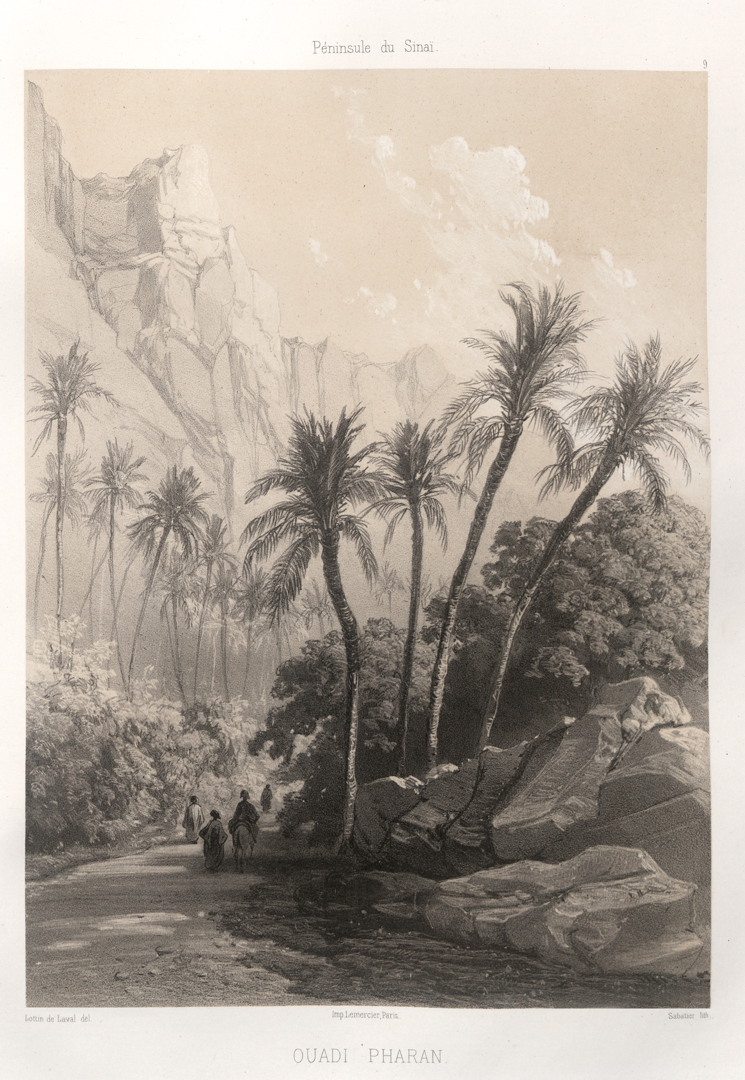 Lottin de Laval, Victor. Voyage dans la péninsule Arabique du Sinai et l'ègypte moyenne. Text- und Tafelband. 2 Bände. 3 Bl., 355 S. Mit 15 Lithografien von Eugène Cicéri und Sabatier nach Zeichnungen des Autors, 17 fotolithografische Reproduktionen von Flachreliefs nach dem Poitevin-Verfahren und 80 Abziehbilder von epigraphischen Inschriften auf 40 Tafeln. 26,5 x 21 cm bis 49 x 31,5 cm. Halbleder d. Z. (leicht berieben und bestoßen) mit goldgeprägten RTitel. Paris, Gide und Cie, 1855-1859.