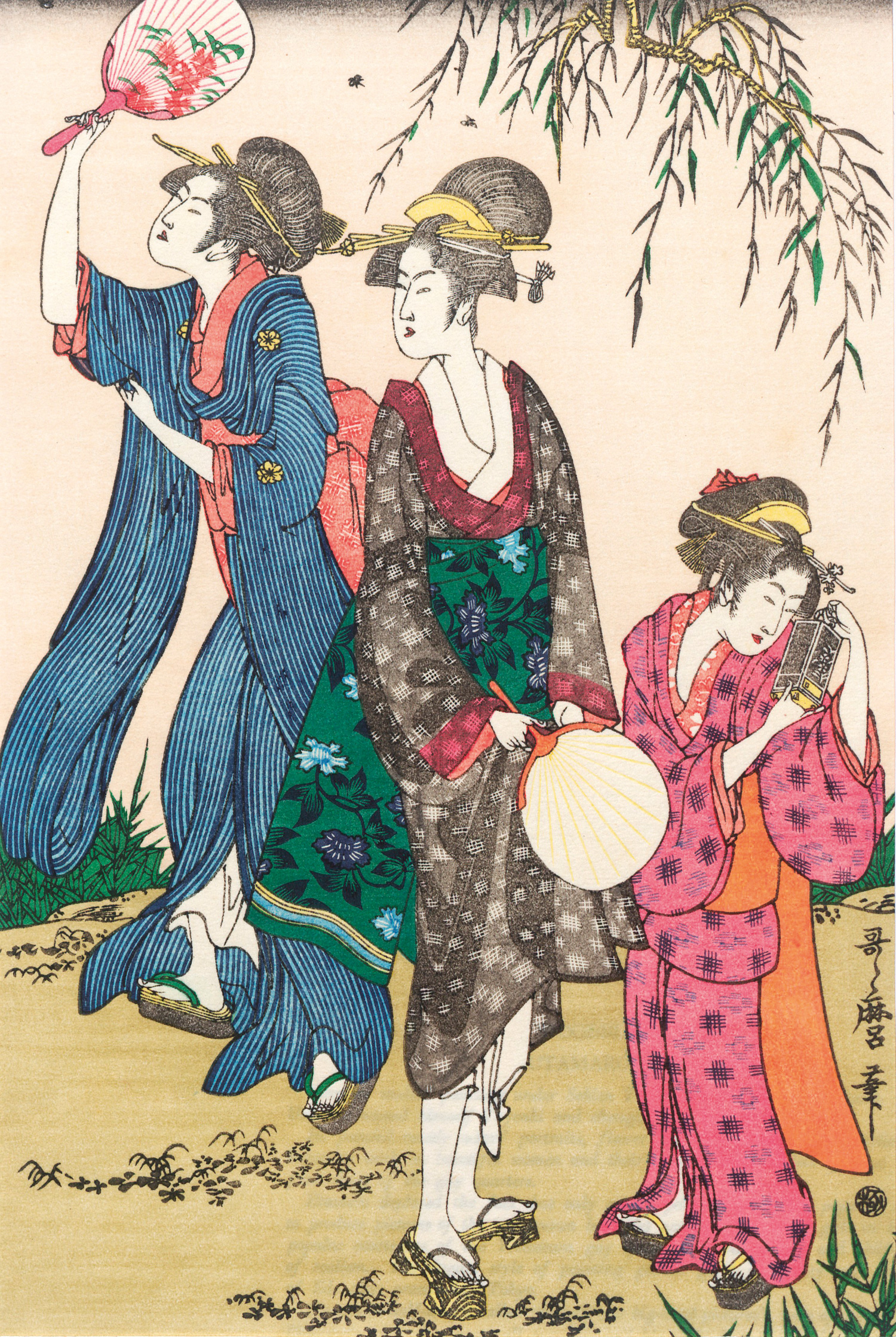 Schöne Nachdrucke nach Utamaro (1753-1806), Harunobu (1725-1770) und Kiyomine (1787-1868). Einzelne Bijins oder Gruppen in prachtvollen Kimonos, im Interieur oder unter blühenden Zweigen. – Von sehr guter Erhaltung.