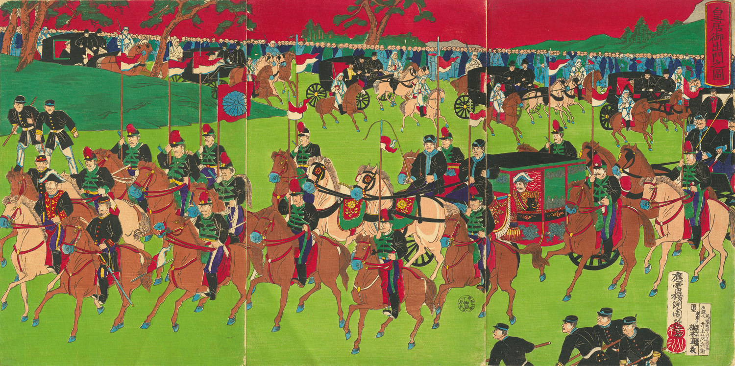 Chikanobu, Toyohara. (Kaiserliche Prozession). Kôkyo goshutsumon no zu. Triptychon, 3-Blatt-Farbholzschnitte, signiert "Yôshu Chikanobu-ga". Jeweils Format ôban tate-e. Zusammen ca. 36 x 73 cm. Tokio, Inoue Mohei, 1876.