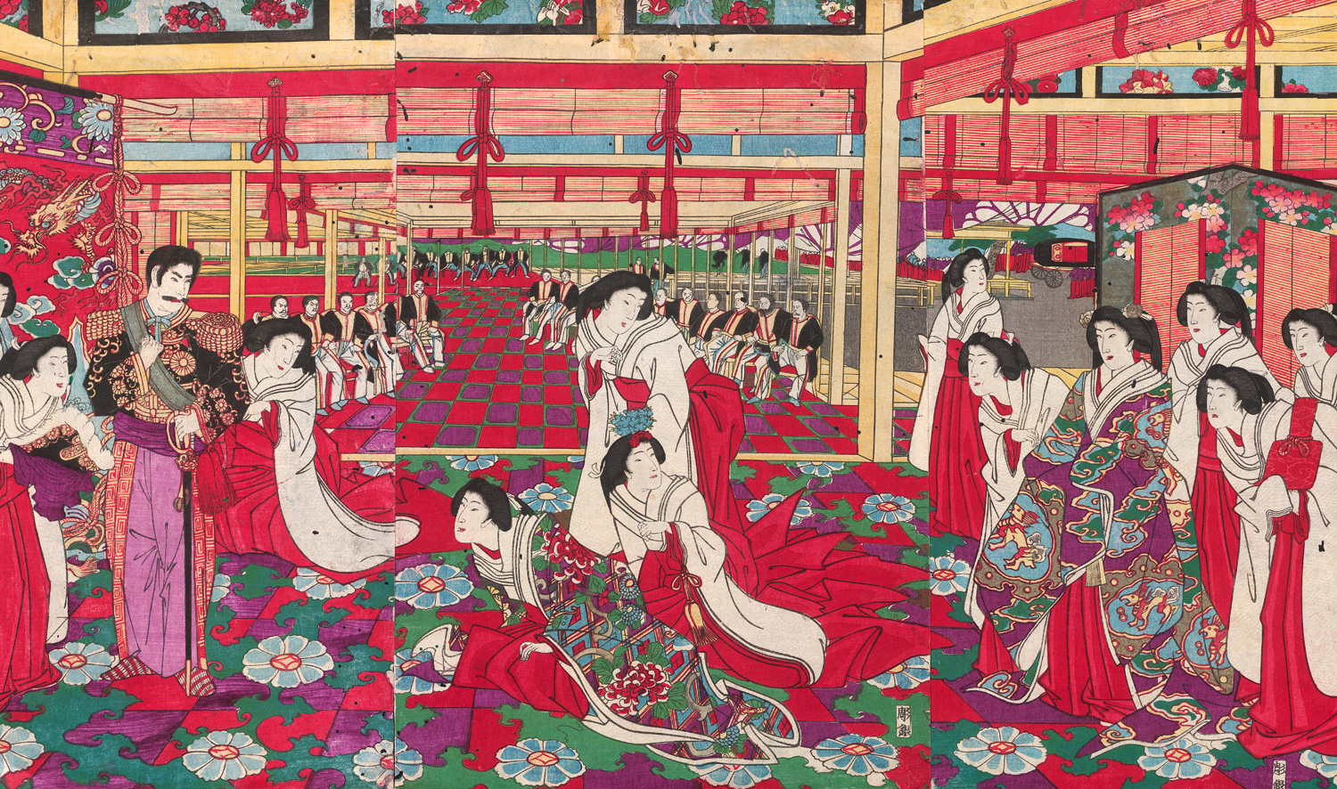 Dambmann 23. – Prachtvolles Triptychon, das eine prunkvolle Palastszene der Meiji-Zeit in Fluchtpunktperspektive zeigt. Im Vordergrund versammeln sich Hofdamen (nyobo) in einem weitläufigen Innenraum des kaiserlichen Palastes. Dominierende Farbtöne sind kräftiges Rot und Violett. Die Szene stellt wohl eine Zeremonie oder einen Empfang dar. Auf dem linken Blatt ist der Kaiser in westlicher Uniform, mit der Hand am Degen, davor kniende Hofdamen. Im Hintergrund sitzt sein männliches Gefolge. – Leicht wurmspurig und leichte Randmängel; verso mit Japanpapier hinterlegte sehr kleine Löchlein in der Darstellung. Schön kräftige Farben.