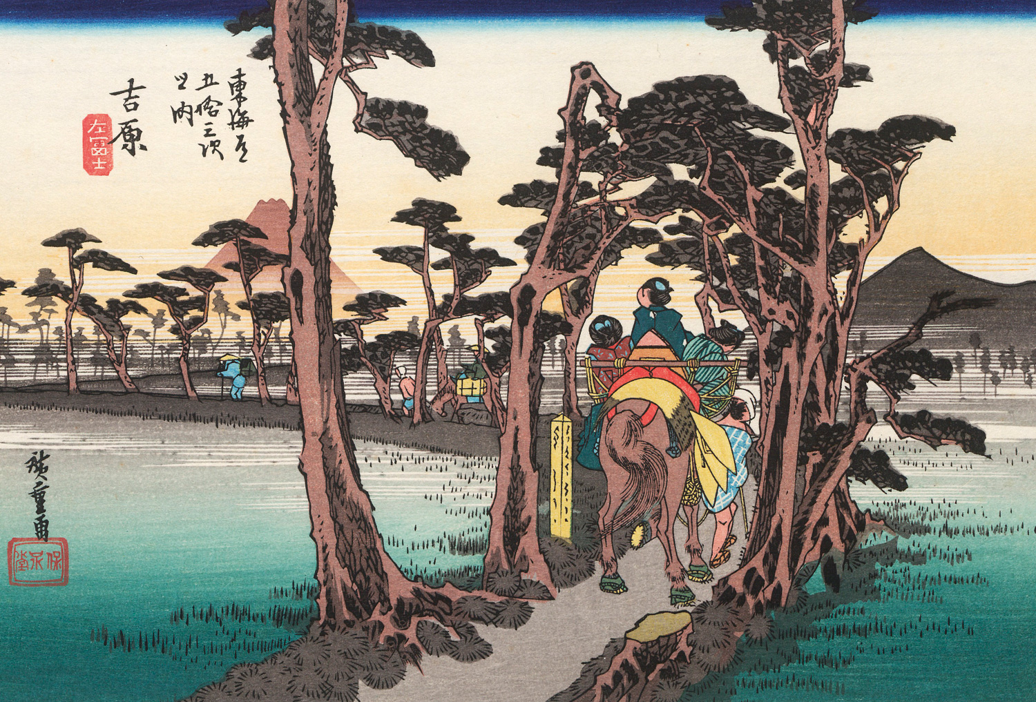Qualitätvolle Reproduktionen: Landschaften und Alltagsszenen entlang der Haupthandelsstraße zwischen Edo (Tokio) und Kyoto nach Hiroshige (1797-1858). – In frischem Zustand. Lediglich die Passepartouts mit Gebrauchsspuren.