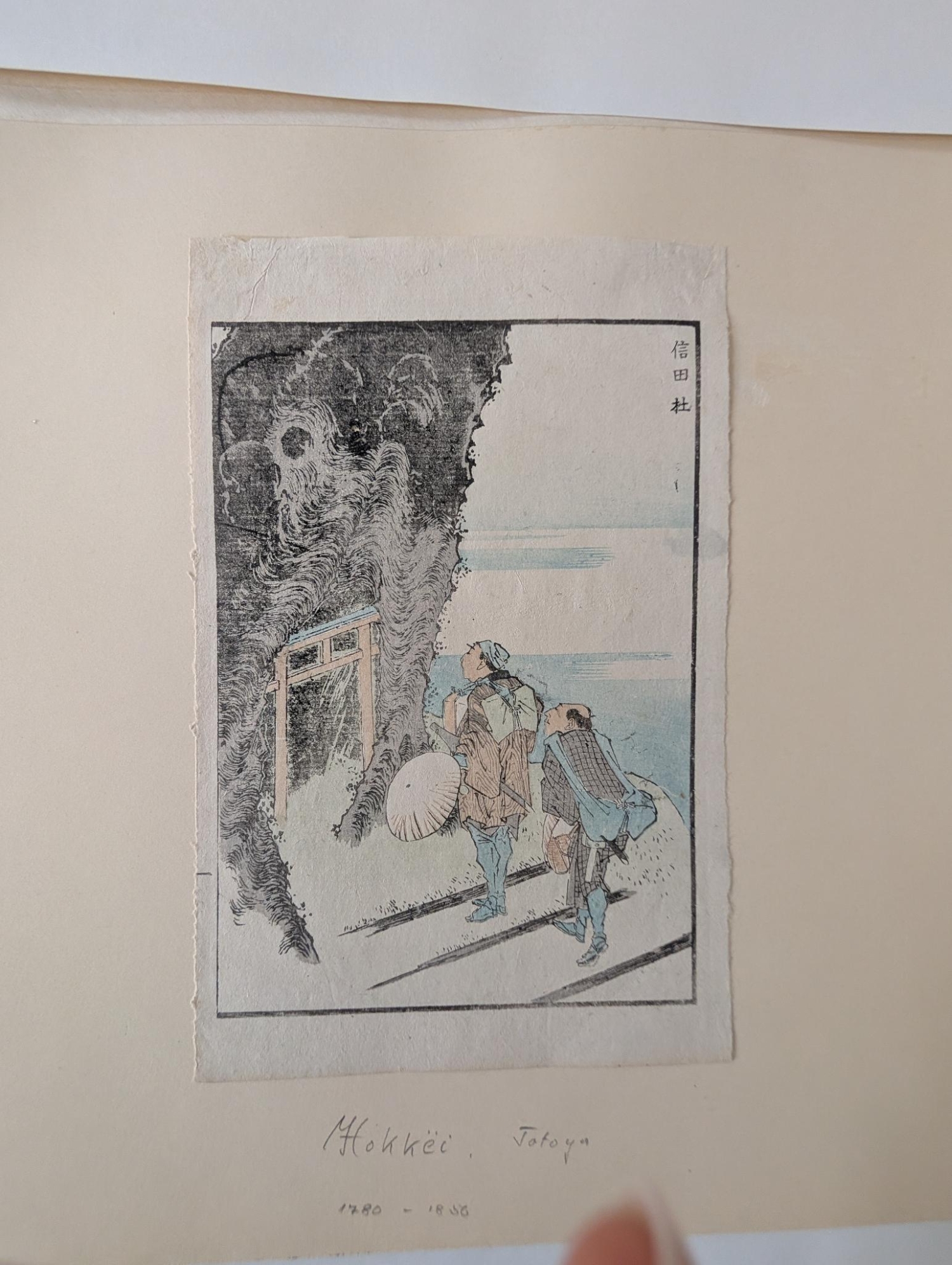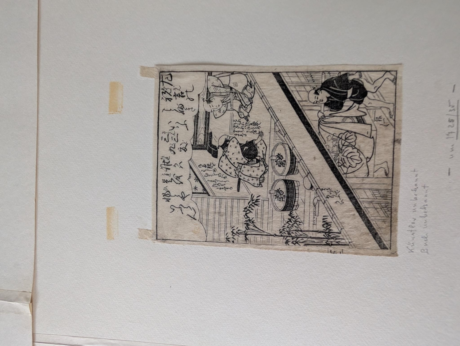 Japanische Buchholzschnitte. Sammlung von 9 Holzschnitt-Albumblättern, davon 3 koloriert, mit unterschiedlichen Darstellungen und von verschiedenen Künstlern, darunter Ando Ichiryusai Hiroshige und Totoya Hokkei. Aus Werken um 1720-1730 (3 Blätter) und um 1830-1850 (6 Blätter). Verschiedene Formate, überwiegend kakuban. Ca. 19 x 15 cm. Sämtlich unter Passepartout. Japan 1720-1850.