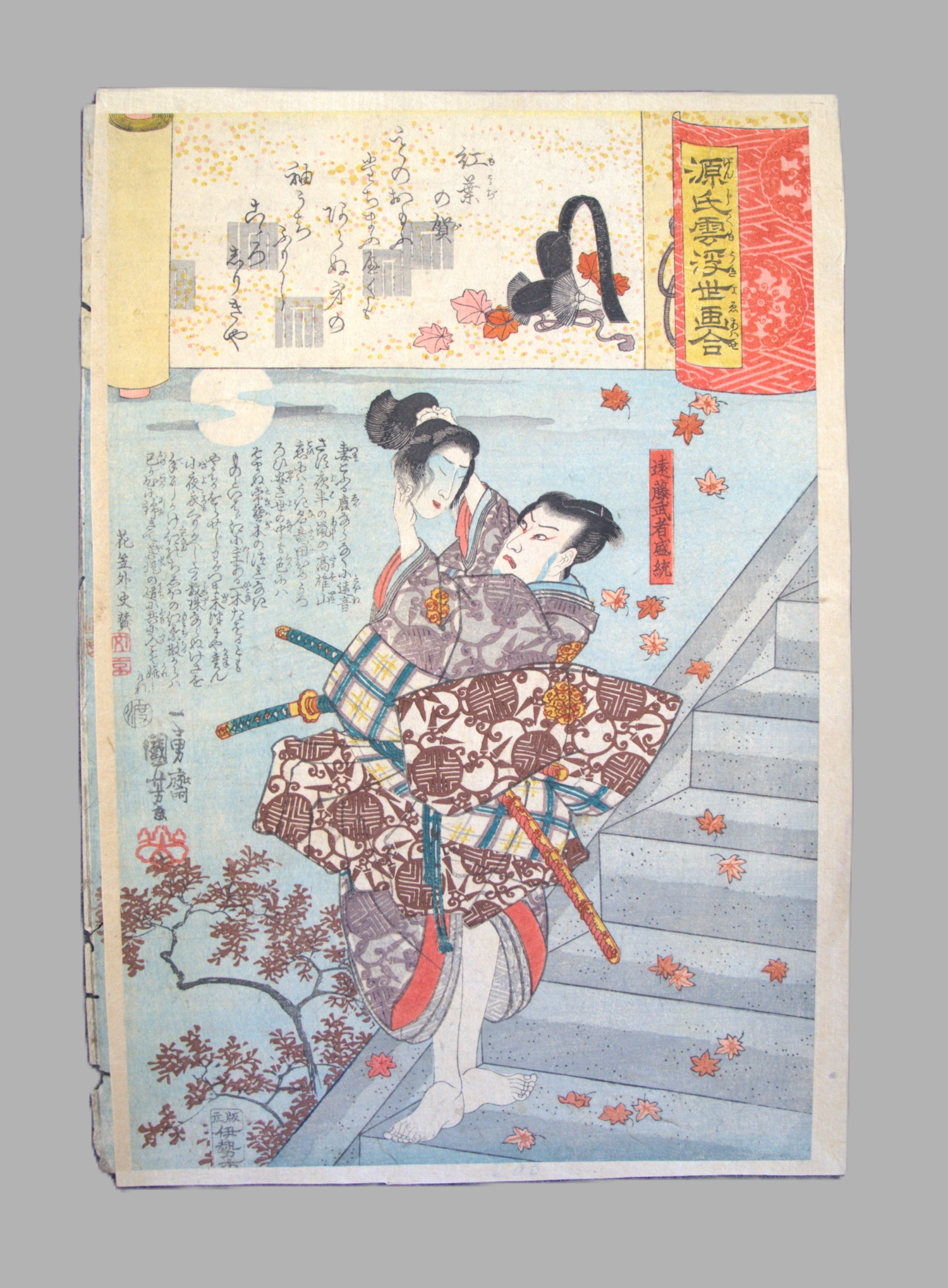 Utagawa Kuniyoshi (1798-1861) gilt als einer der einfallsreichsten Ukiyo-e-Meister seiner Zeit, der zahlreiche aufwendig gestaltete Serien hervorbrachte. Darunter auch die reizvolle Serie Genji kumo ukiyo-e awase, der diese besonders umfangreiche Holzschnittsammlung entstammen, ein eindrucksvoller Zyklus, der das Epos Genji monogatari zum Thema hat und Szenen daraus illustriert. Dieses klassische Werk aus dem 11. Jahrhundert - oft als erster psychologischer Roman der japanischen Literaturgeschichte bezeichnet - erzählt die bewegte Geschichte des Hofadligen Hikaru Genji und seiner Verstrickungen in die Welt der höfischen Liebe und Intrigen. In meisterhafter Weise sind die dramatischen Szenen aus diesem Epos ins Bild gebracht; oben ist jede Darstellung mit einer Kartusche auf einer Schriftrolle versehen, die ein zur Szene passendes Hanko-Gedicht sowie stilisierte Schriftzeichen als Kapitelreferenz enthält.