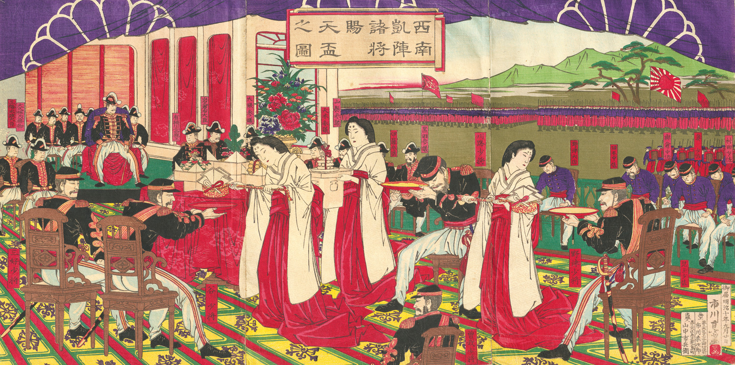 Raijirô, Ichikawa. (Siegeszeremonie der Regierungstruppen nach der Satsuma-Rebellion). Sainan gajin shoshoshi tenpai no zu (japonice: Ansicht der kaiserlichen Geschenk-Schalen, überreicht von allen Kommandanten im Heereslager nach dem Sieg im Südwesten). Triptychon. 3 Blatt-Farbholzschnitte, signiert "Ichikawa Kansai-ga". Jeweils Format ôban tate-e. Zusammen ca. 36 x 73 cm. Unter Kartonpassepartout. Tokio, bei Yamanaka Ichibei, 1877.